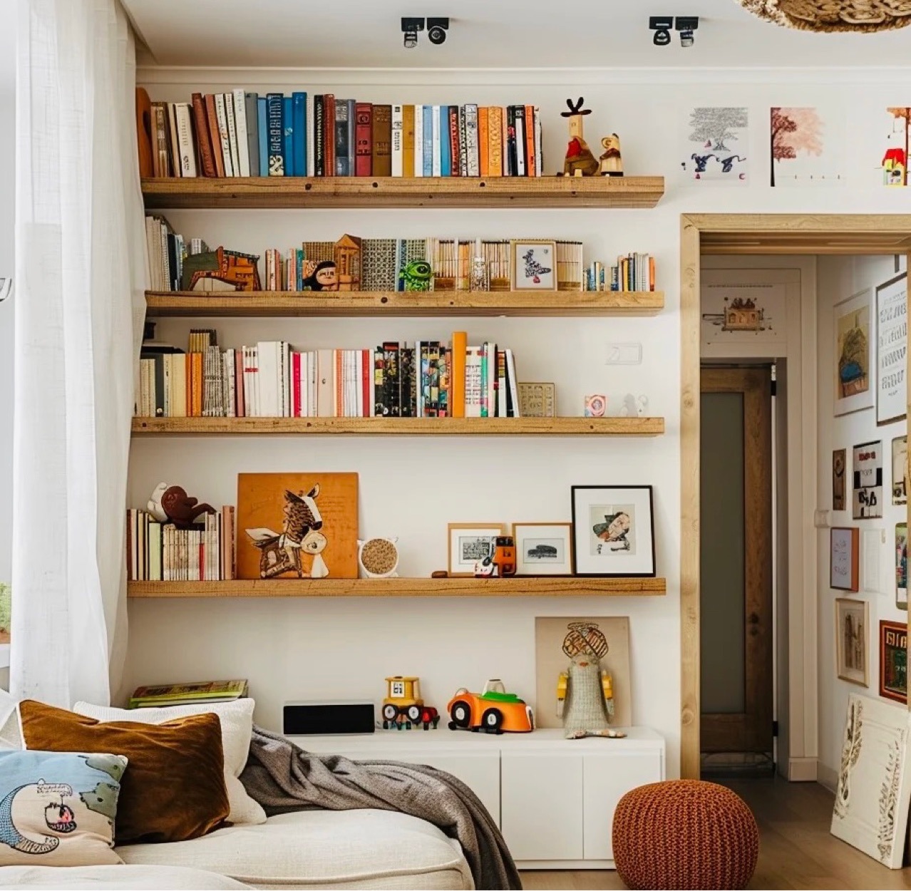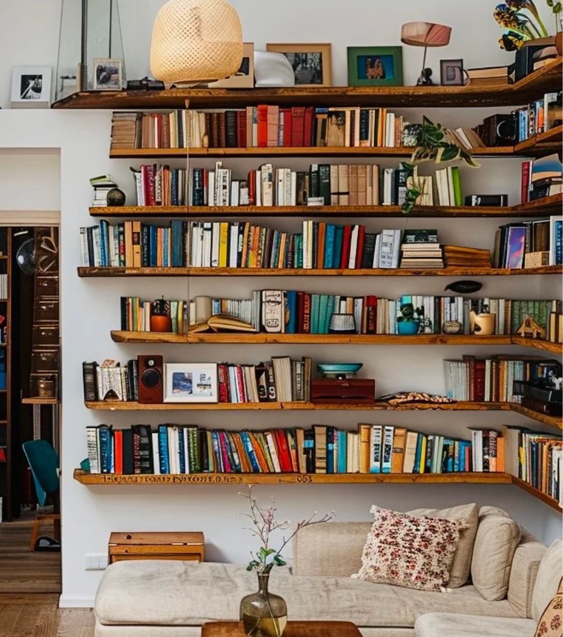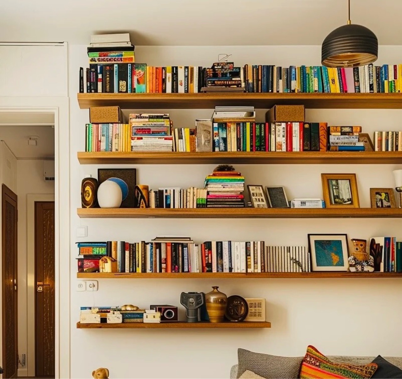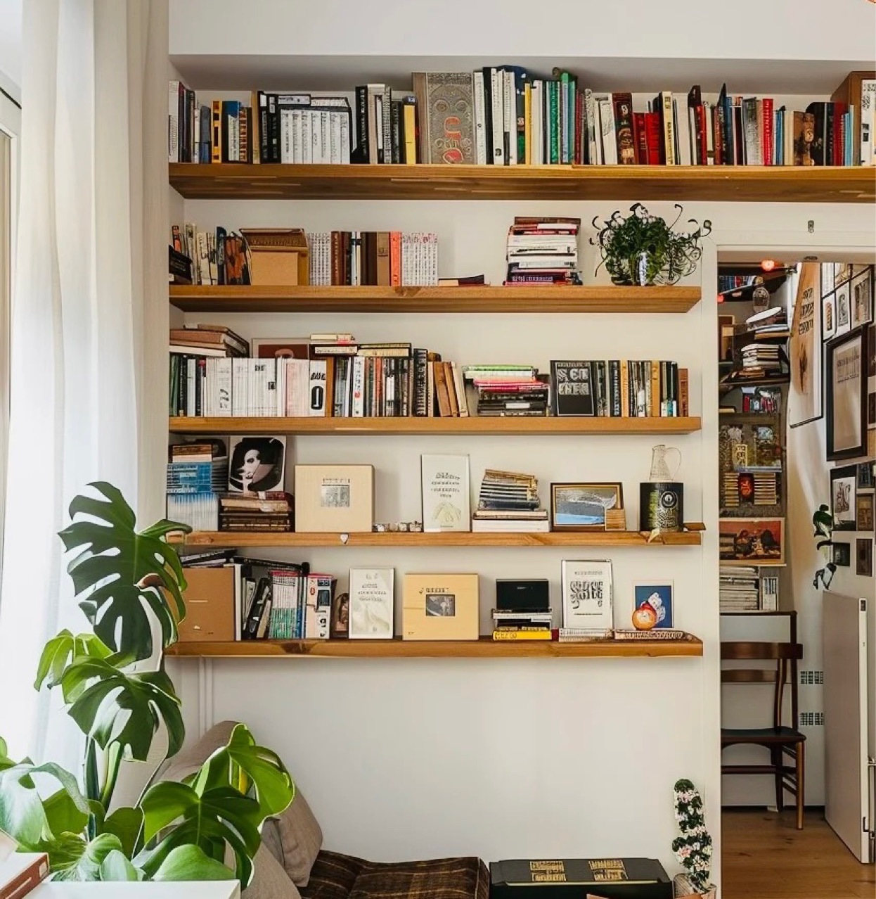 実木一字仕切り棚壁に本棚を掛けます。
