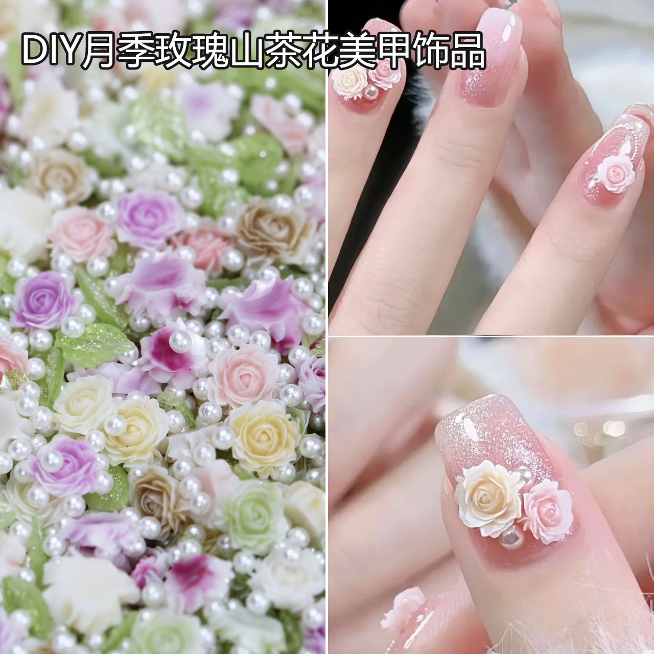 DIY ネイルアートジュエリーバラローズ椿立体花葉パール混合マニキュアウェアラブルネイルアクセサリー