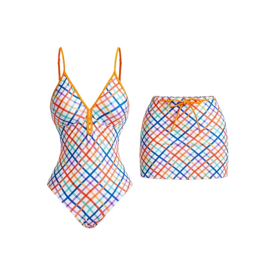 2026欧美跨境新款比基尼连体女士保守泳装亚马逊格子印花裙式泳衣