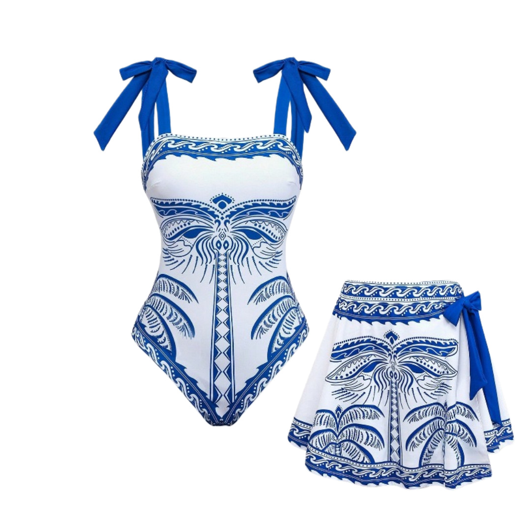 2024欧米連体ビキニ2点セットアマゾン青花磁器プリント復古ビーチリゾート温泉水着