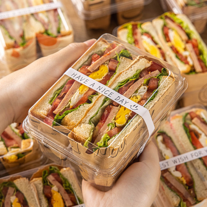 透明サンドイッチ包装箱 トーストパンテイクアウト箱 2コンパートメントパン箱 包装箱 ステッカー ケーキロール コーティング