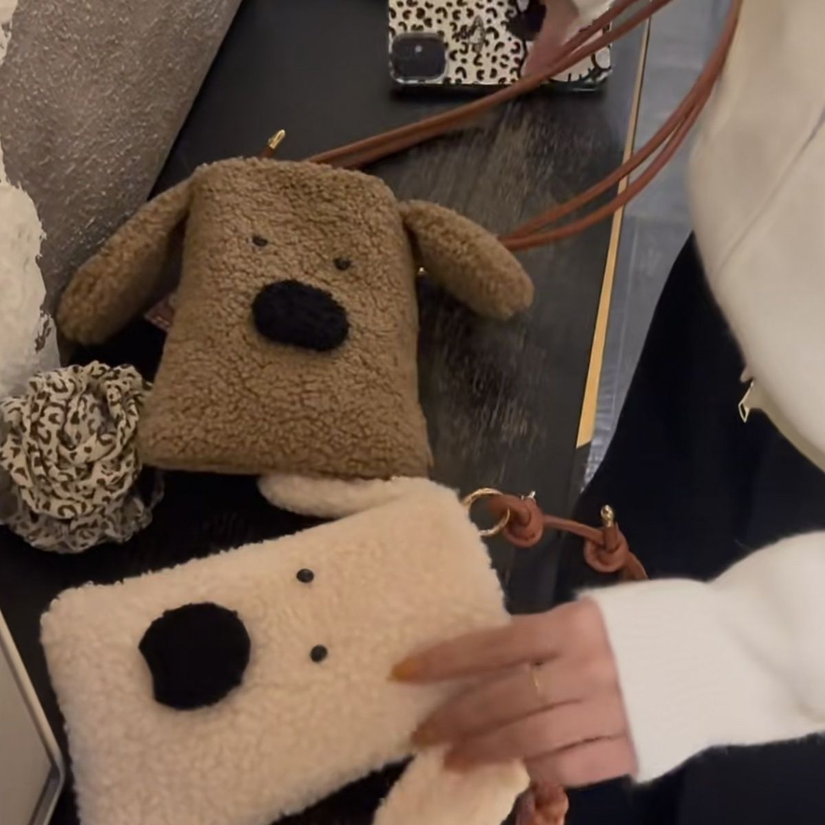 可爱毛绒小狗单肩斜挎包2025秋冬新款毛线编织包手机包卡通零钱包
