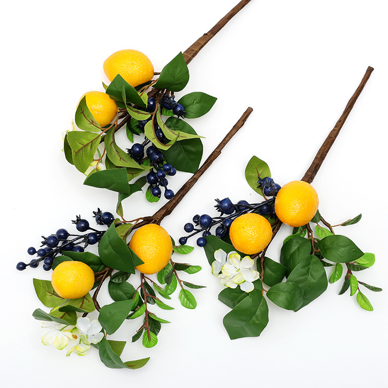 クロスボーダーのシミュレーションの果実は葉の小枝のレモンのブルーベリーの果実を持ってクリスマスの造花の家のデスクトップの生け花の置物を飾ります。