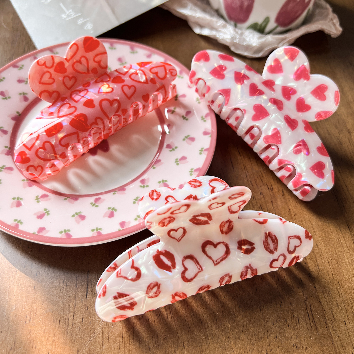 国境を越えて人気のバラの愛のプリントは新しいバレンタインデーの雰囲気感の女性の髪を挟んでサメの髪を挟みます。