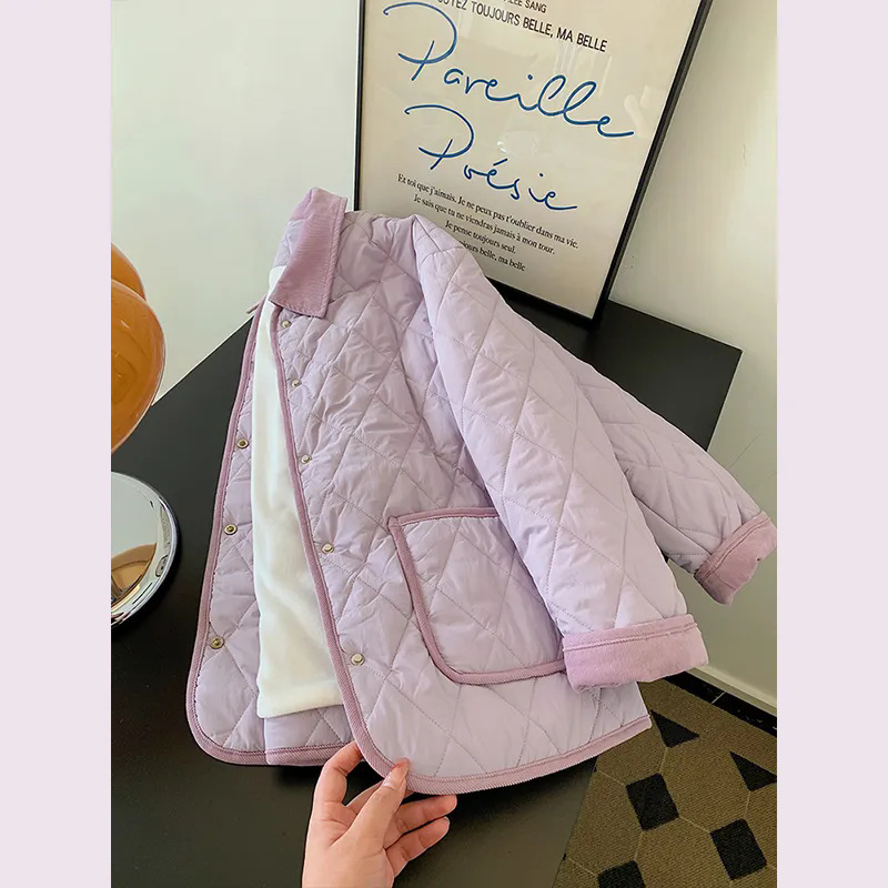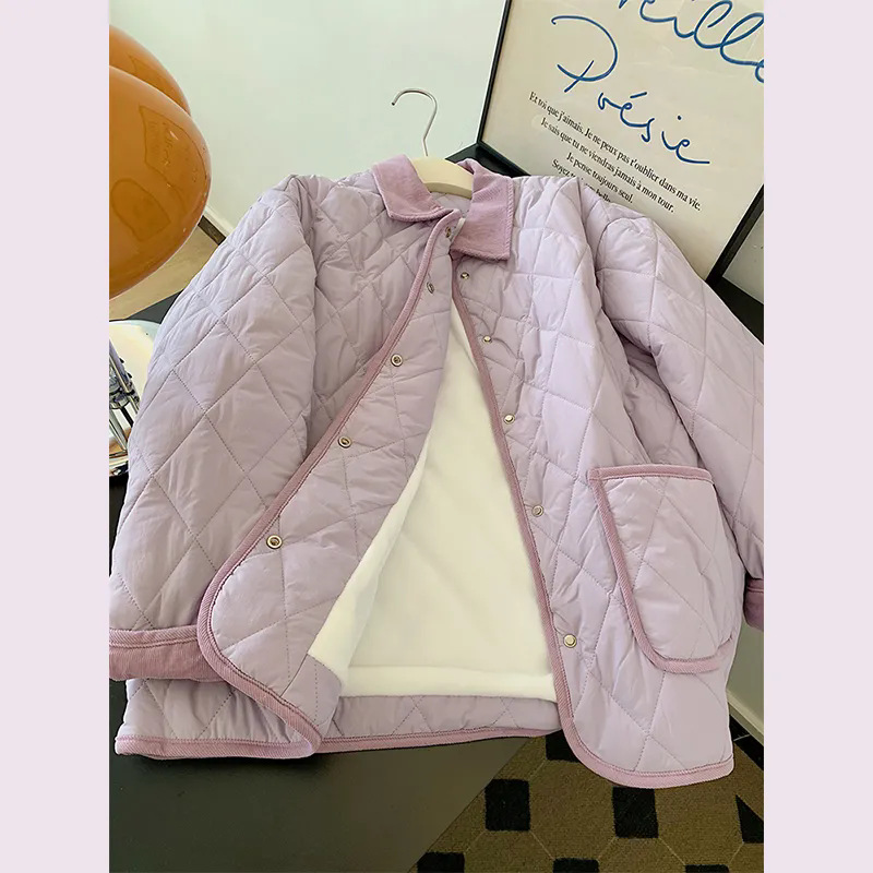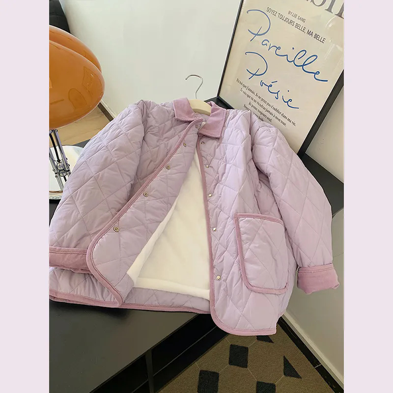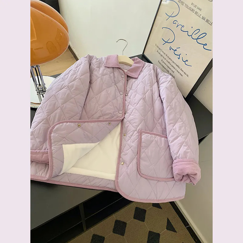 紫の小香風菱格綿服女2024年の新型冬の韓国版はゆったりしています。