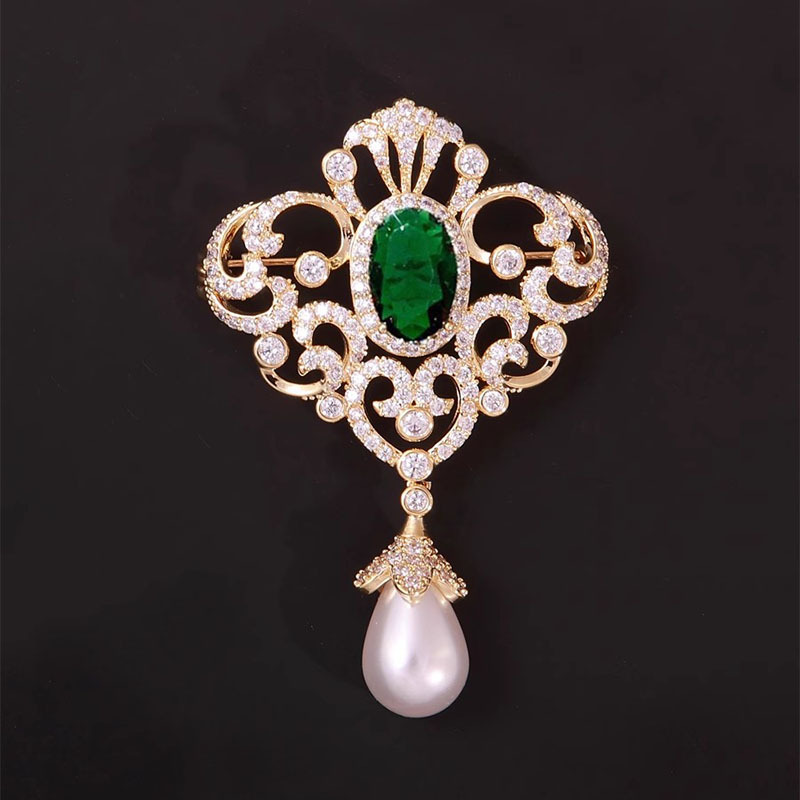 レトロな宮廷風の祖母の緑の透かし彫りの吊り珠のブローチの高級な女性の新型の豪華な気質の胸の花のピンは装飾品を配合します。