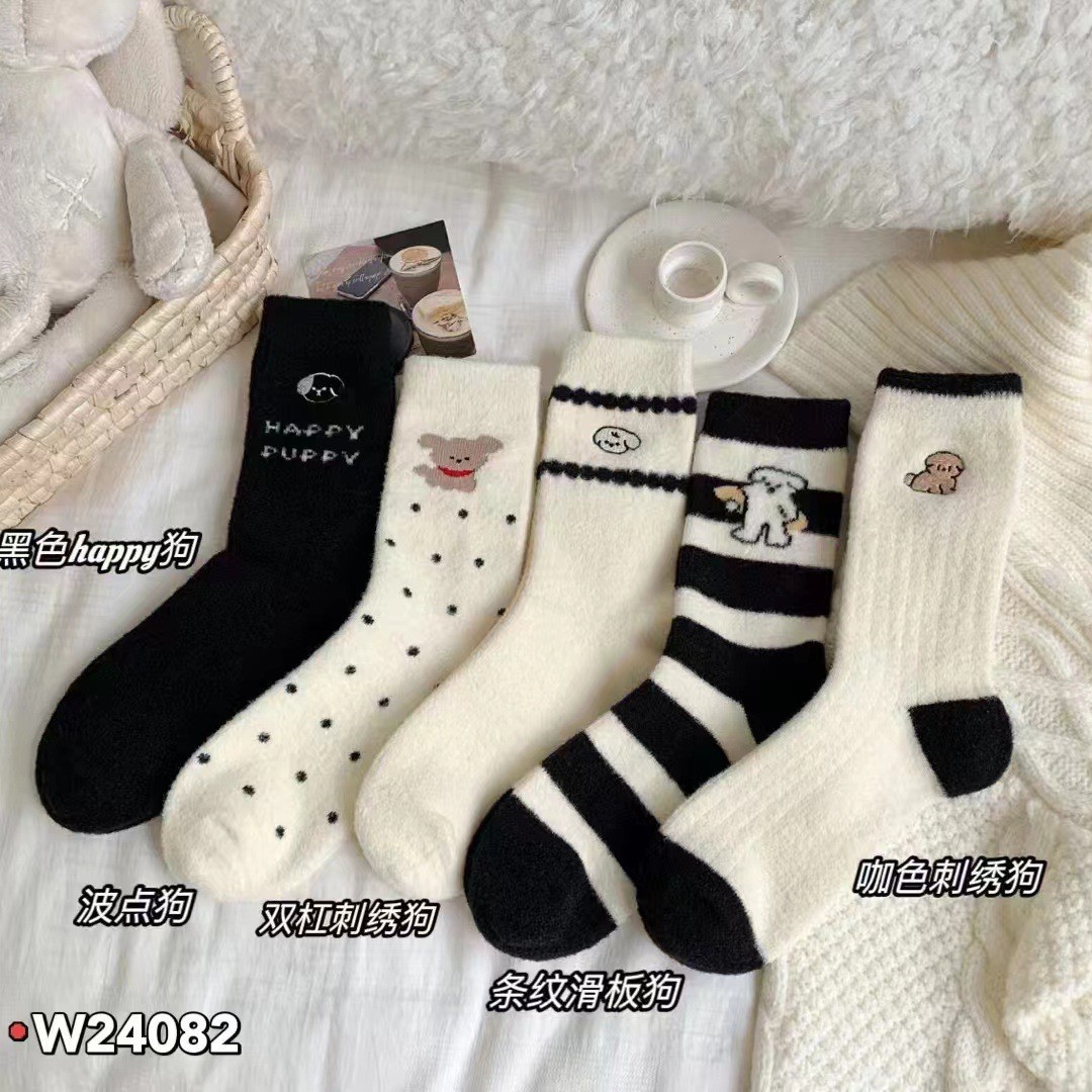 秋冬のベルベットは保温性の高い女性靴下の白黒刺繍がかわいい子犬の中筒靴下の日系オーストラリアのベルベット靴下を厚くした