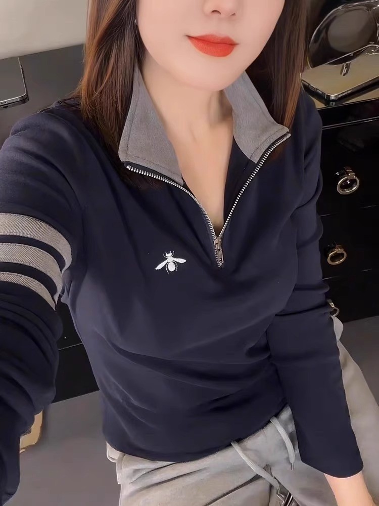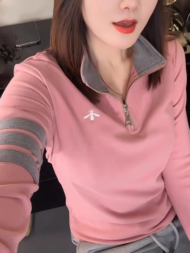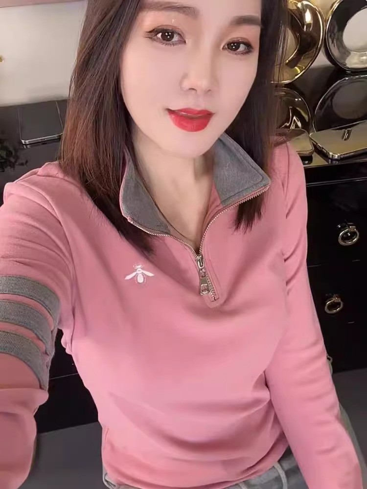 厂家直供时尚秋冬德绒连帽打底衫女撞色纽扣长袖减龄百搭显瘦上衣