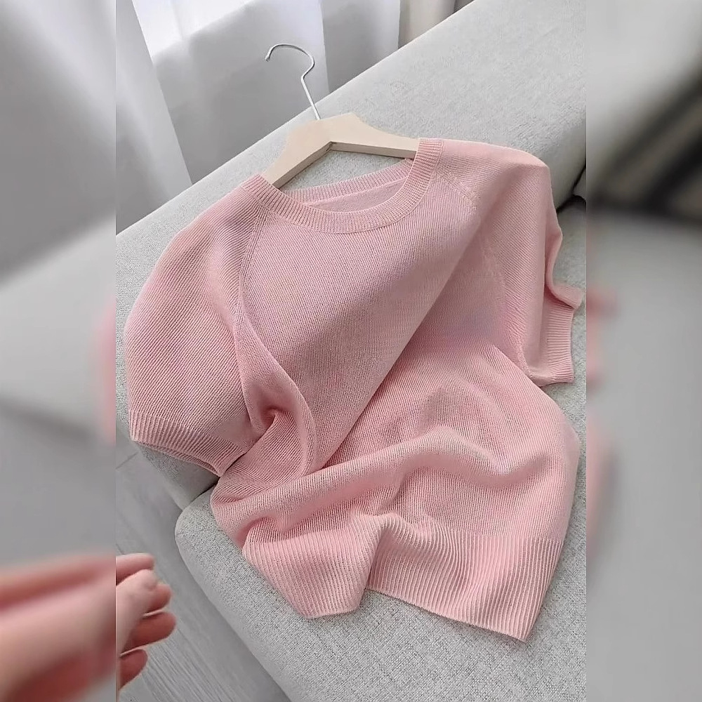 ハイエンドの韓国スタイルのユニークで美しいピンクのアイスシルク半袖Tシャツ、女性用夏の薄手のニットセータートップ