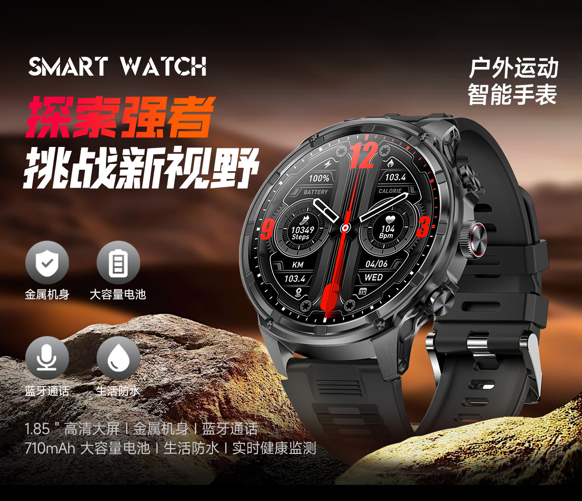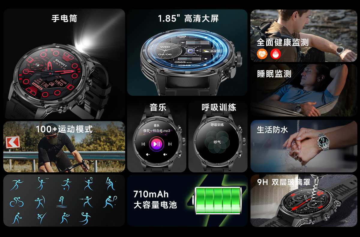 | 主要功能(Major function) | 一键蓝牙连接,来电提醒推送、短信提醒推送、微信提醒推送、QQ提醒推送、运动记录(计步、里程等)、轨迹地图,睡眠监测、久坐提醒、卡路里计算、秒表、低电量提醒、抬手亮屏、快速充电、超低功耗、心率、血压、震动、运动模式,远程拍照、音乐控制,智能闹铃、天气预报,高清大屏,多表盘切换,微信运动。通话 | |