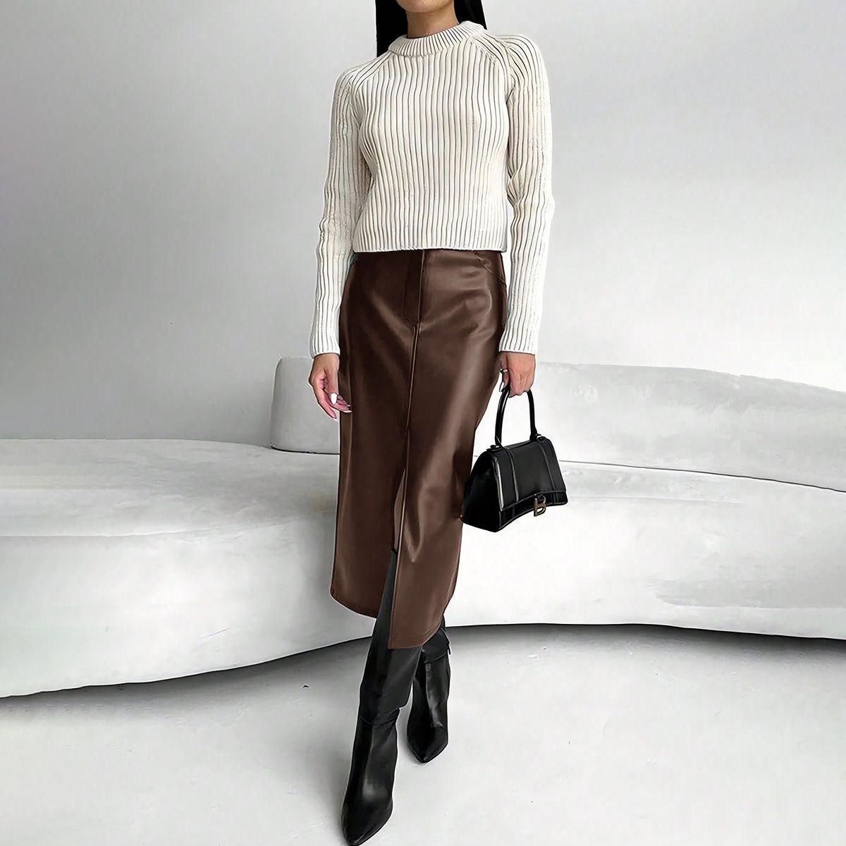 国境を越えた欧米の女装2024革のデザイン感は、純色の高腰シンプルな革の半身のスカートを開いている