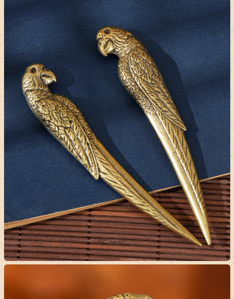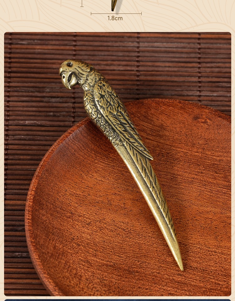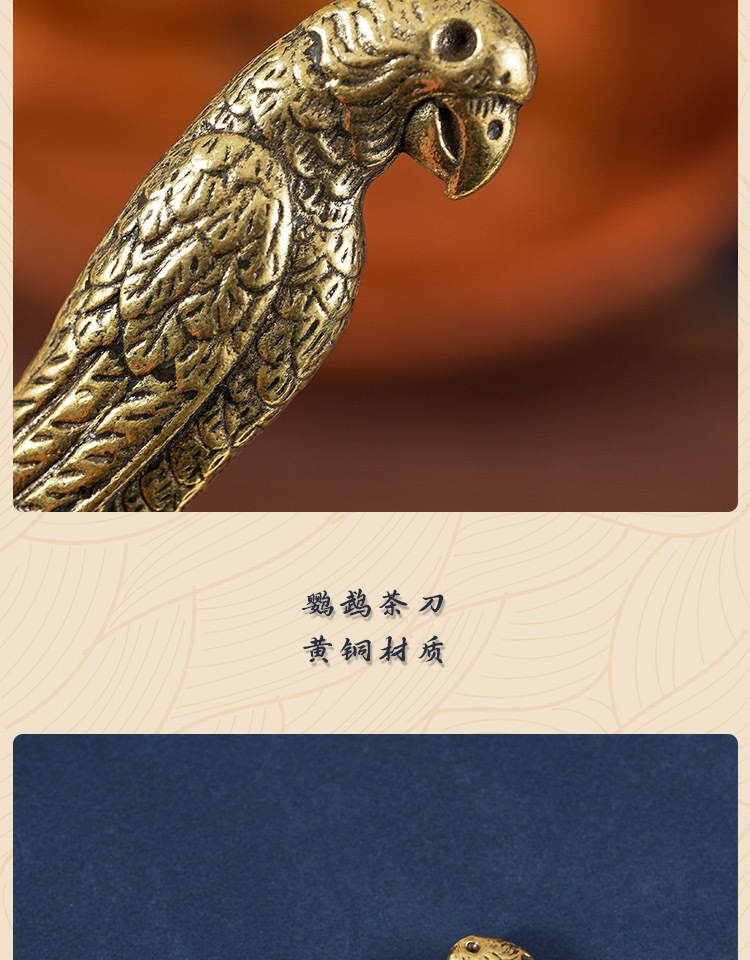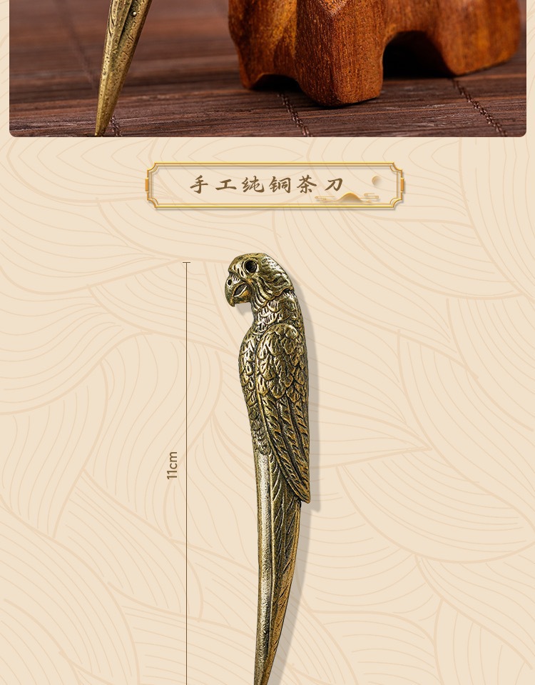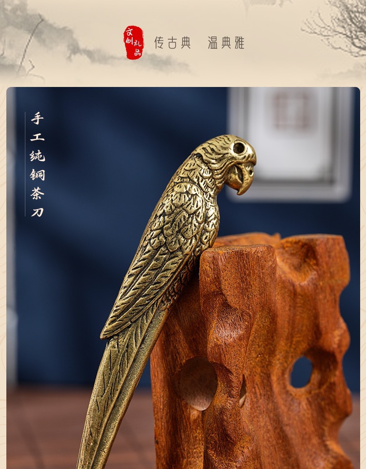 真鍮のオウムの茶刀は古茶餅の茶器をまねます。
