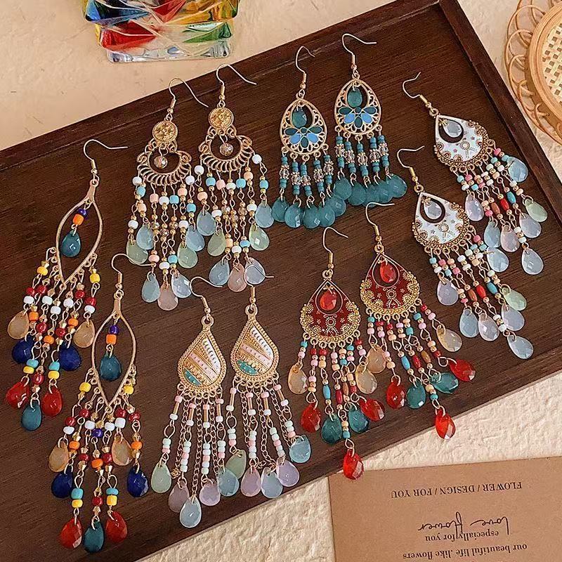 民族风水晶长款流苏耳环个性拍照显脸瘦夸张耳饰波西米亚旅游饰品