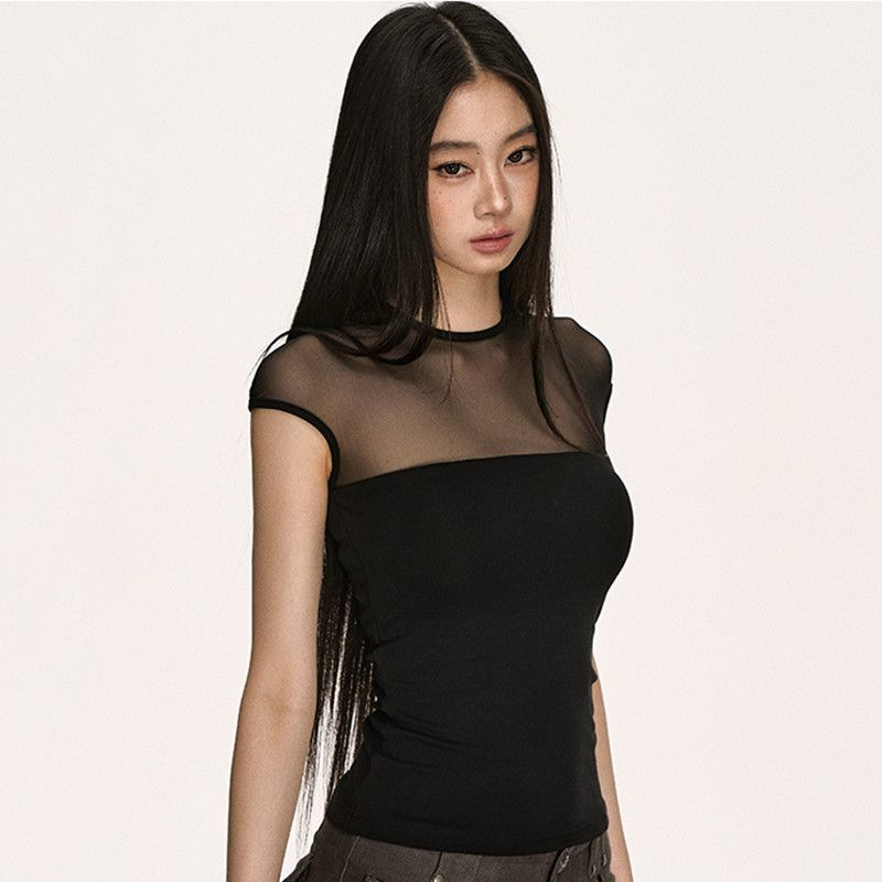 美式复古网纱拼接圆领短袖T恤女夏季新款辣妹风修身显瘦百搭上衣