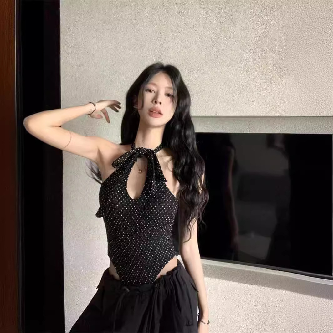 夏用のスリムフィットストラップ付きホットガールフェイクワンピーストップス、レトロな水玉模様のバックレスホルターネックキャミソール付き