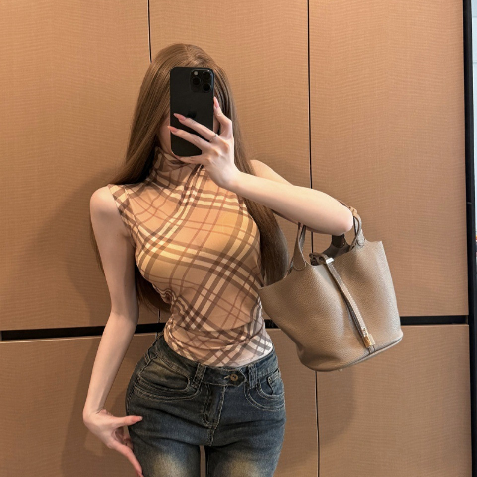 8711#夏季新款高级复古半高领无袖收腰背心修身显瘦短款百搭上衣