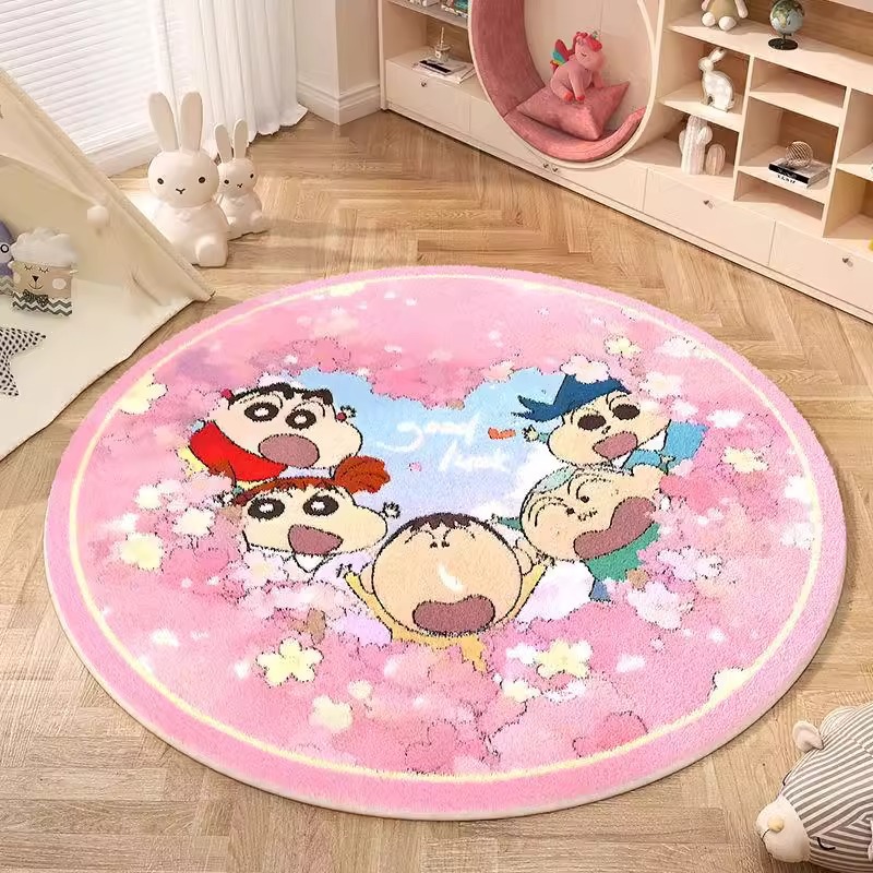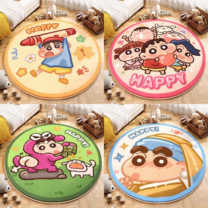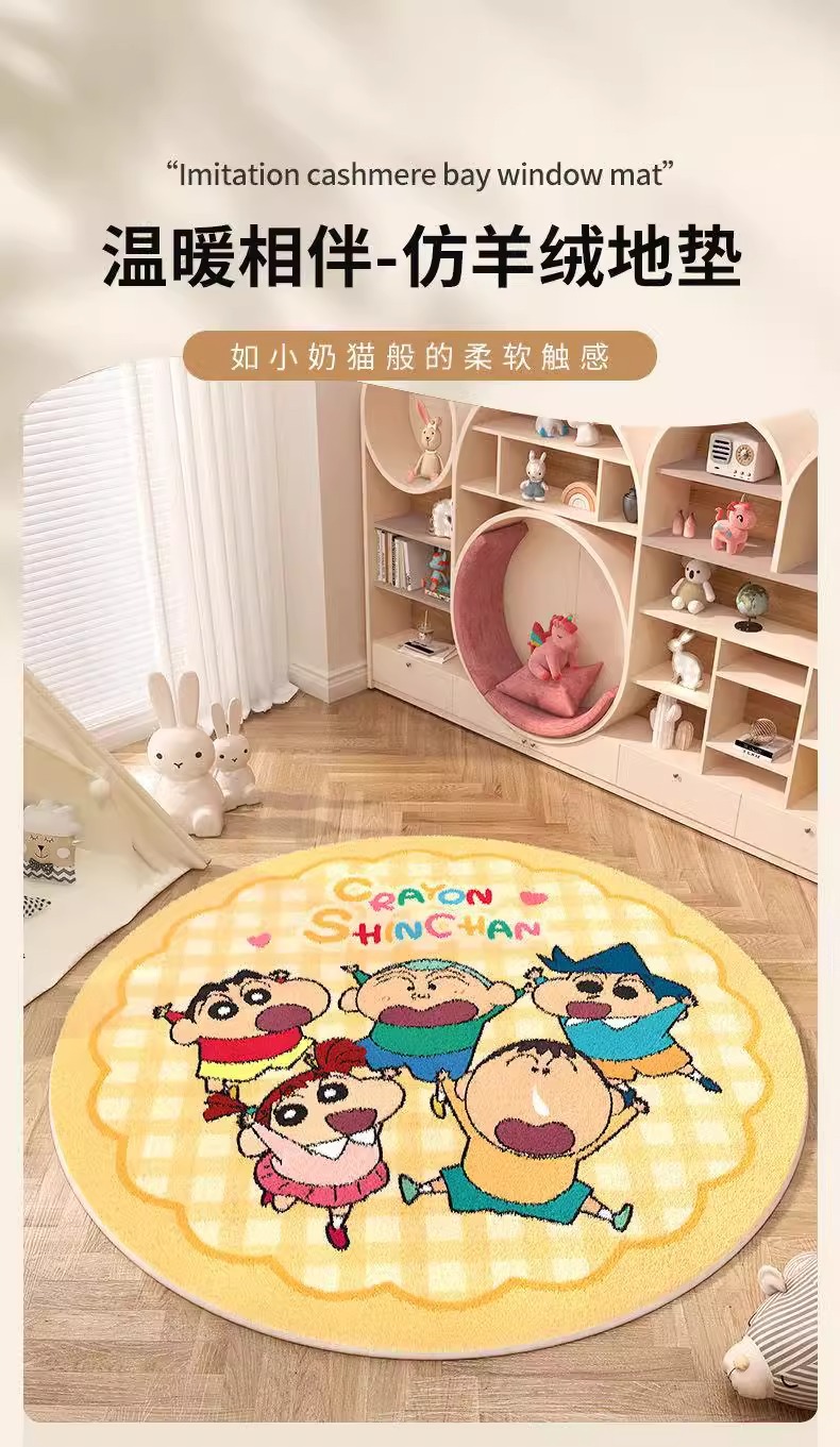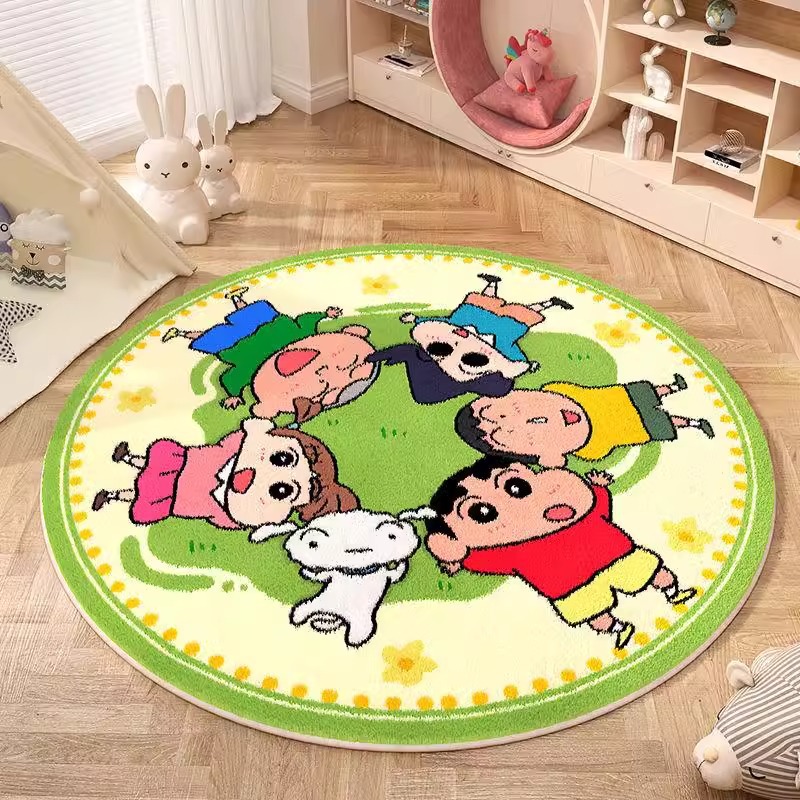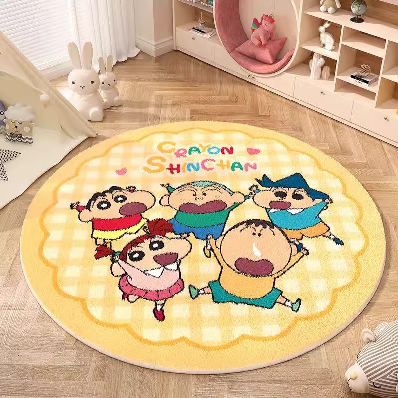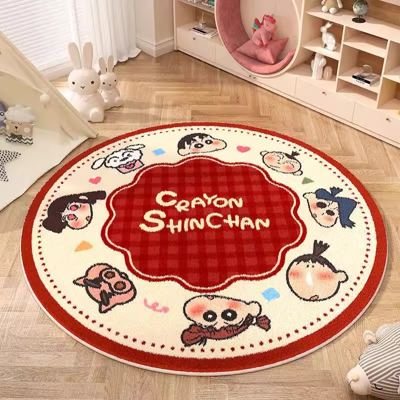 クレヨンしんちゃん 寝室用マット ベッドサイドマット リビングルーム用コーヒーテーブルマット ベランダマット 丸型漫画風フロアマット カーペット 漫画プリント