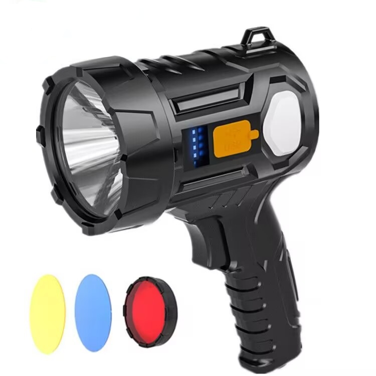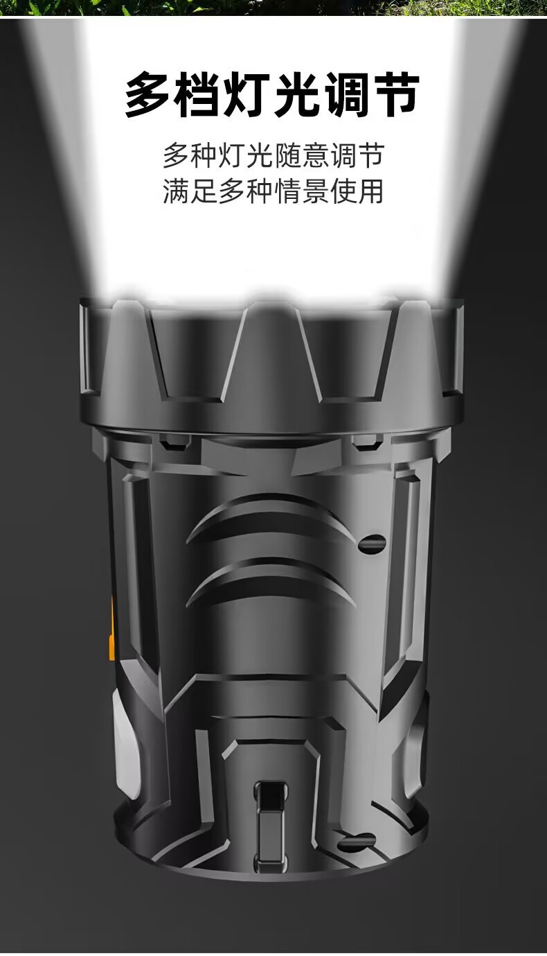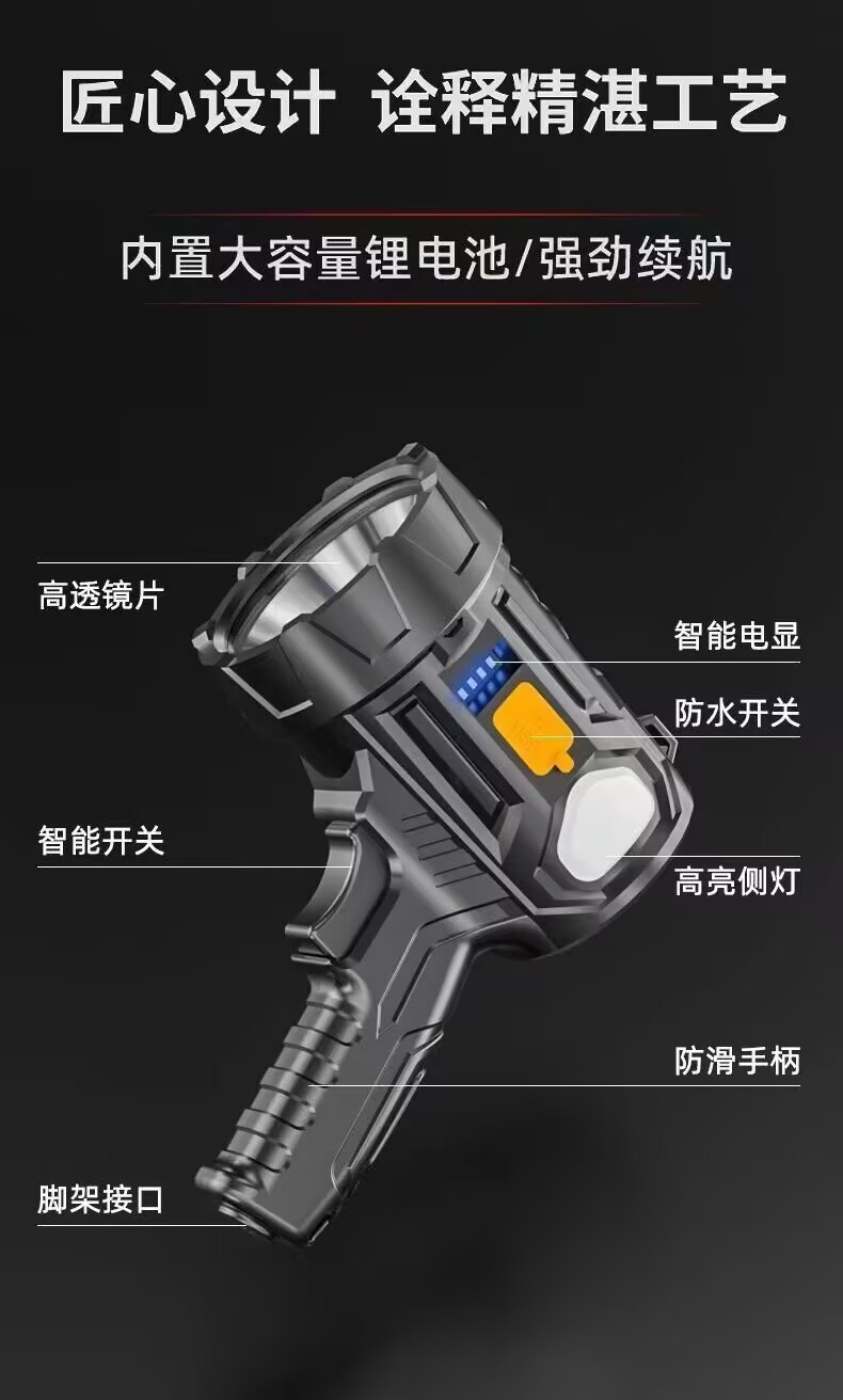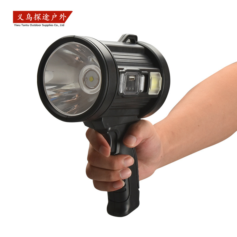 屋外LED強光懐中電灯充電携帯長航続遠射サーチライトサイドライト付き赤青フラッシュ警告灯