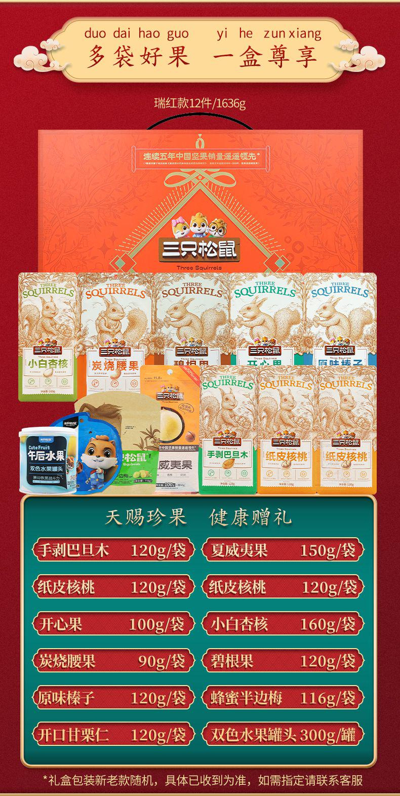 リスナッツ三匹大礼箱1636g/12袋混合間食大ギフトバッグ祝日プレゼントナッツ箱