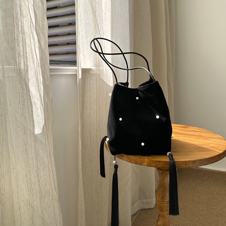 2025 秋の新ニッチデザインベルベットパールバケットバッグタッセルショルダーバッグ新中国風の女性のバッグ中国風レトロ