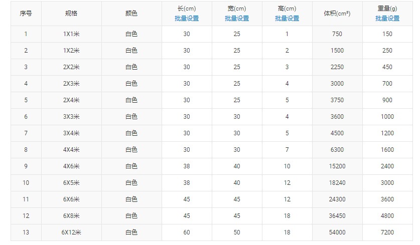 仕様 1X 1m,1X 2m,2X 2m,2X 3m,2X 4m,3X 3m,3X 4m,4X 4m,4X 6m,6X 5m,6X 6m,6X 8m,6X 12m