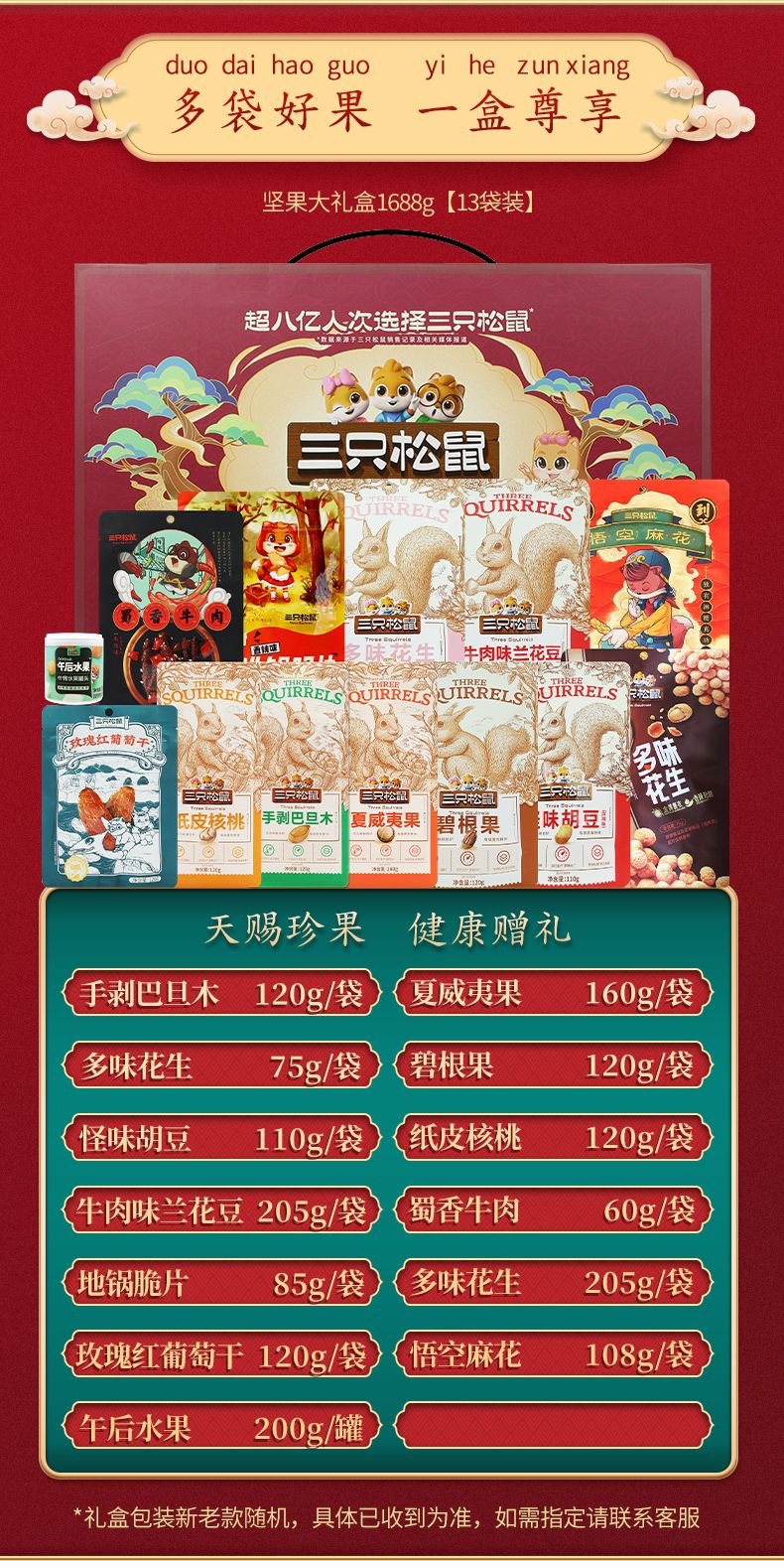 リスナッツ三匹大礼箱1673g/13袋混合間食大包祝日プレゼントナッツ一箱