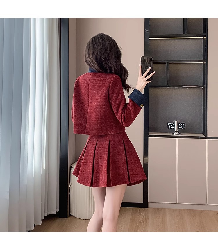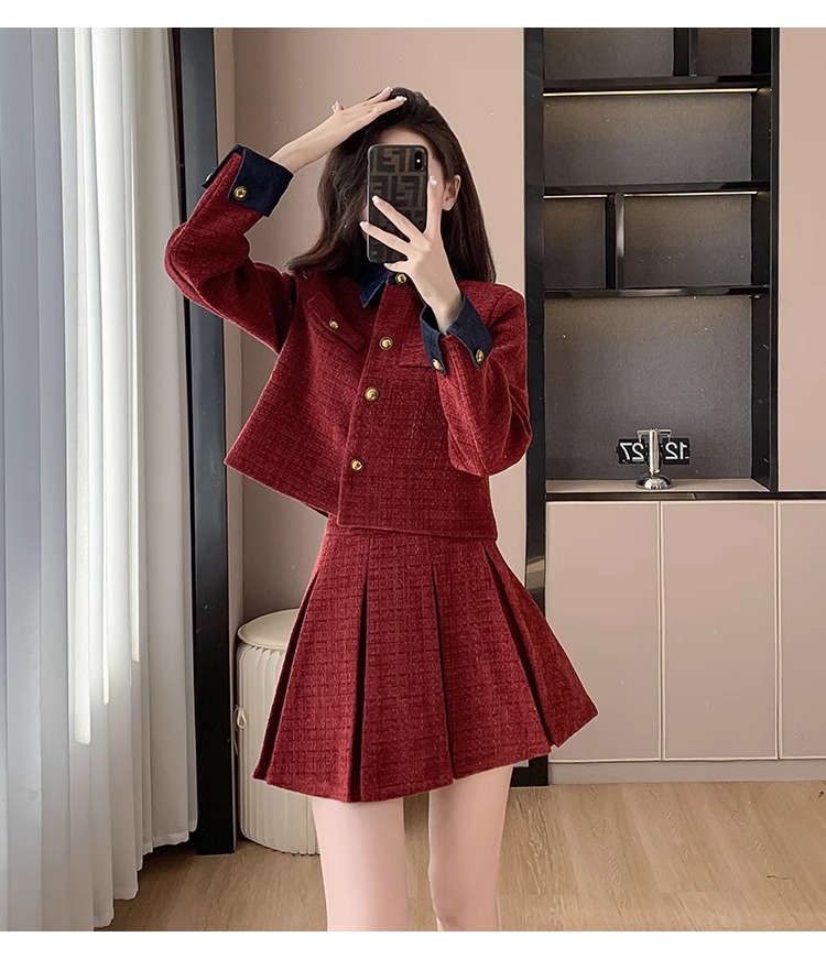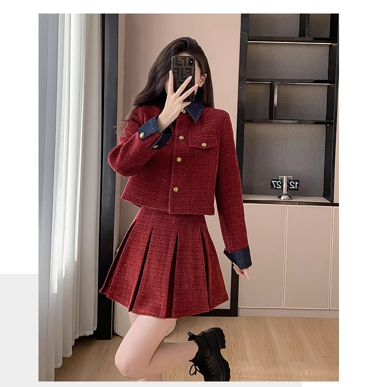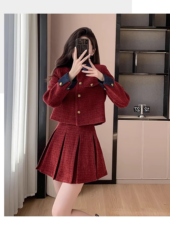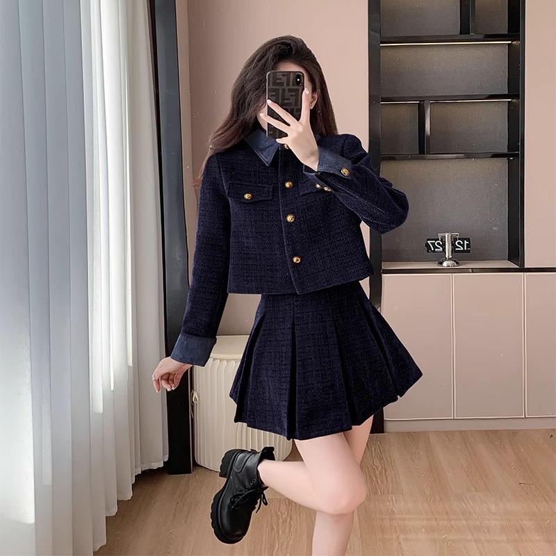 法式千金名媛小香风西装外套秋冬新款高腰显瘦百褶半身裙两件套女