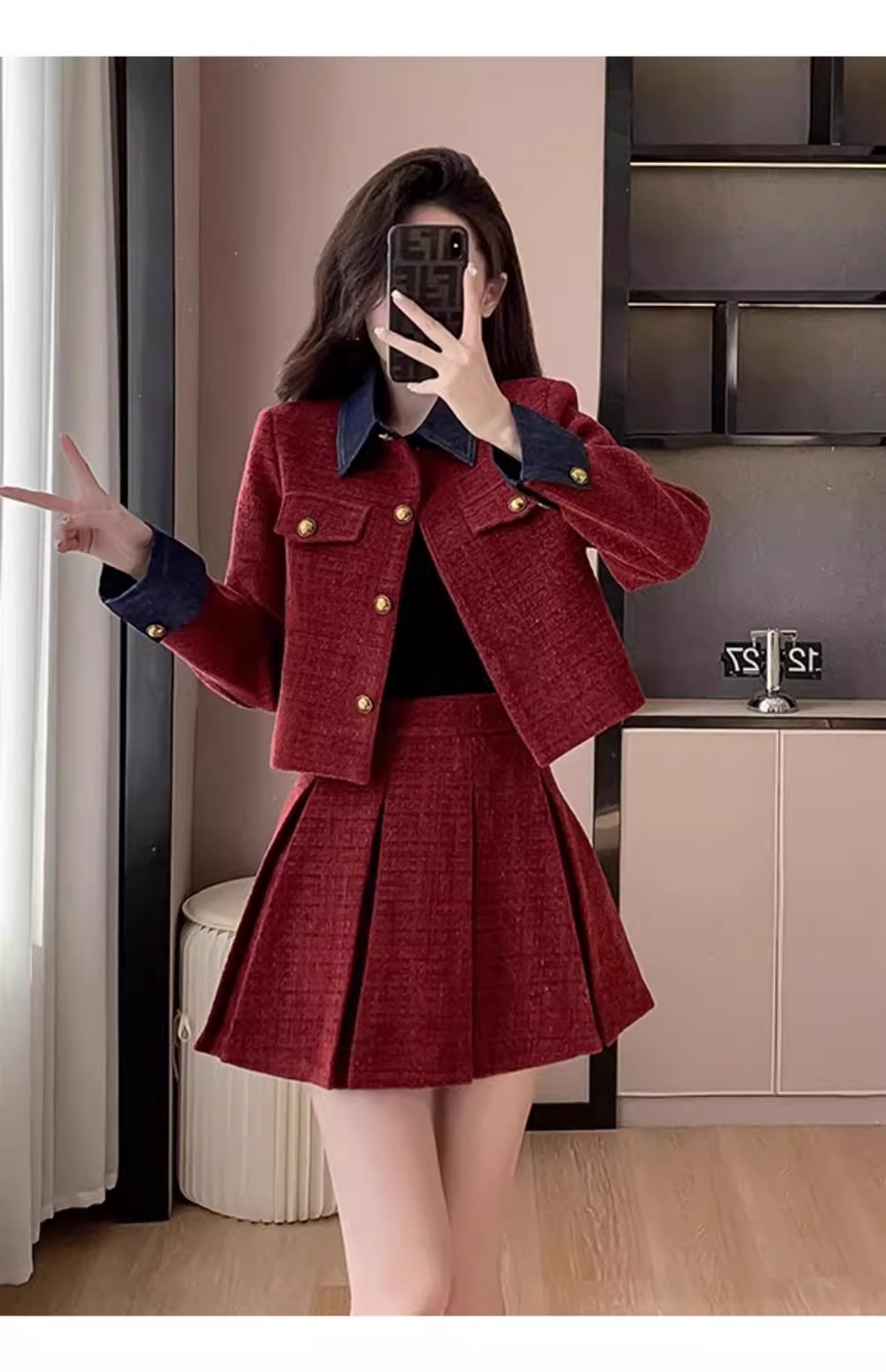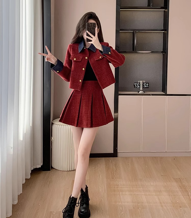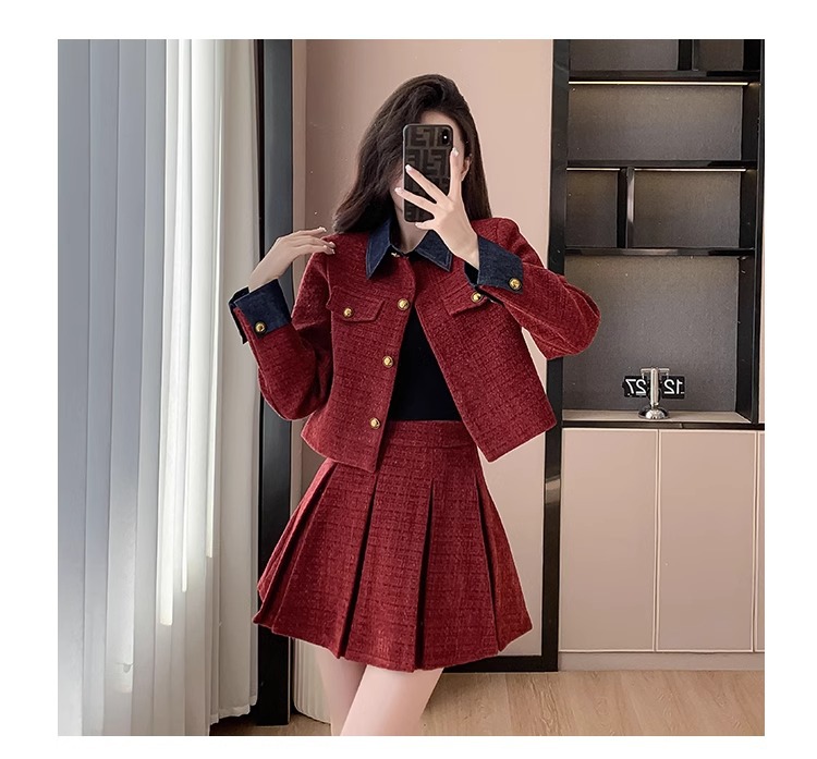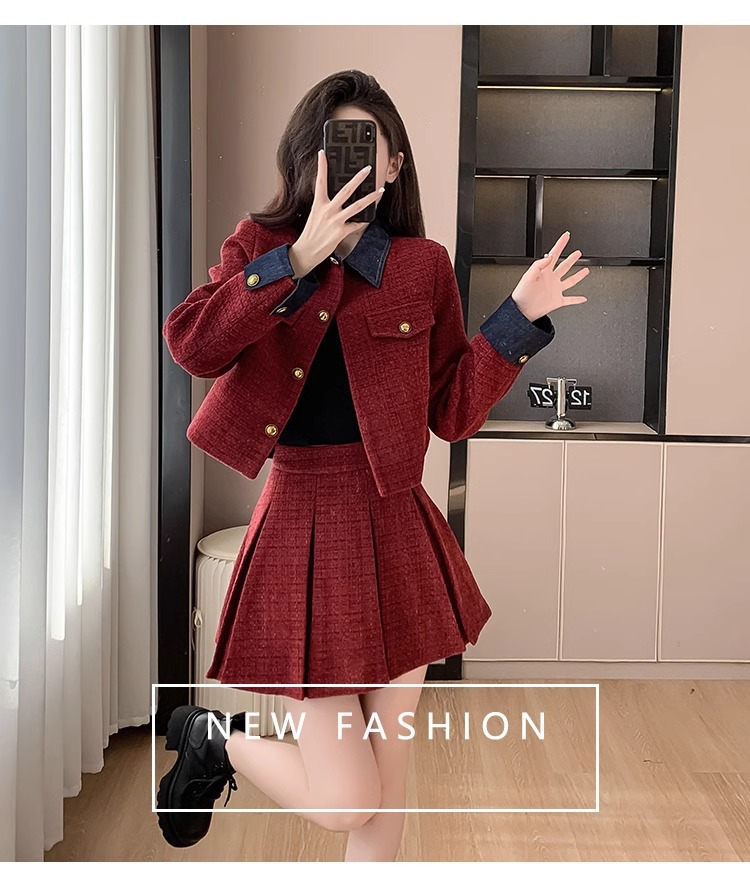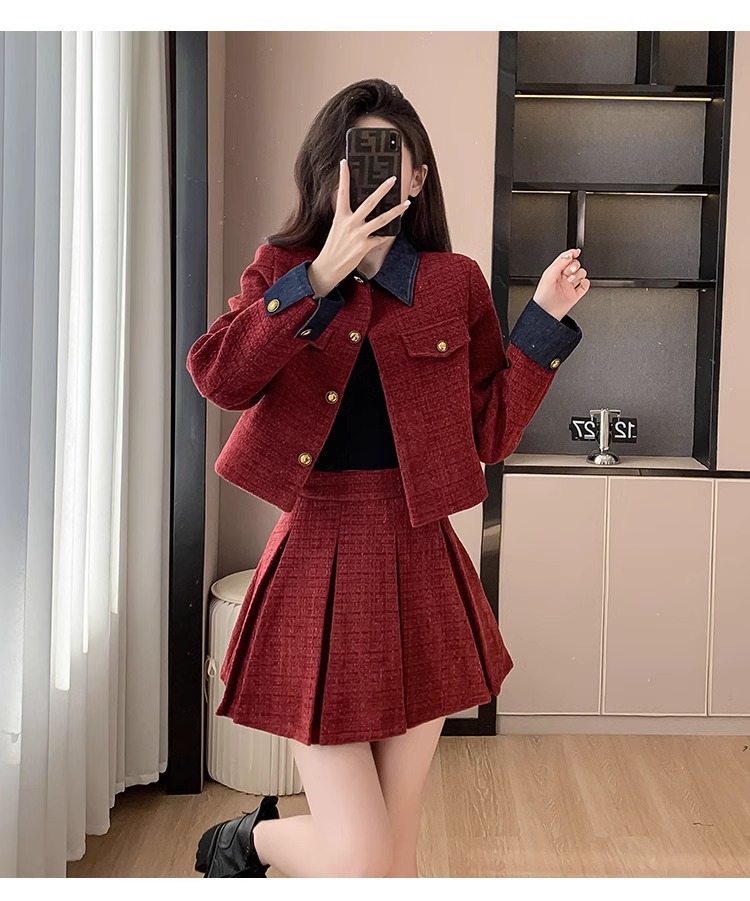 法式千金名媛小香风西装外套秋冬新款高腰显瘦百褶半身裙两件套女