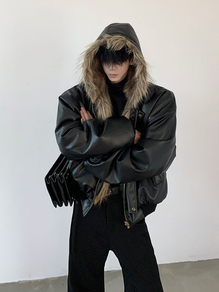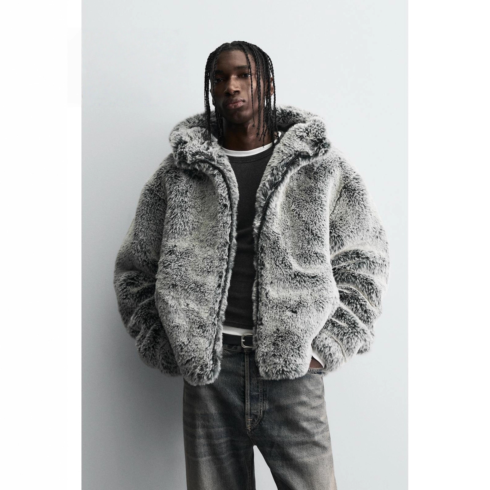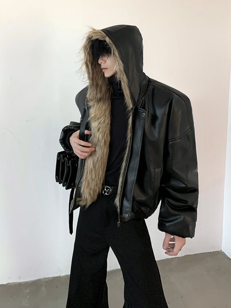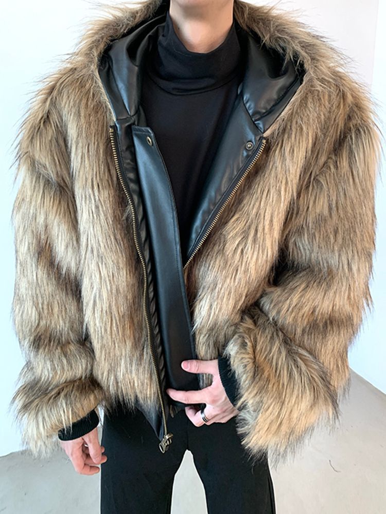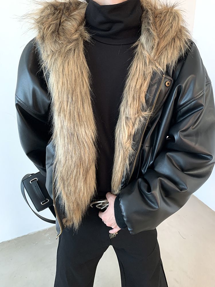 2025冬季新品男装连帽人造皮草夹克外套百搭加厚毛毛绒大衣