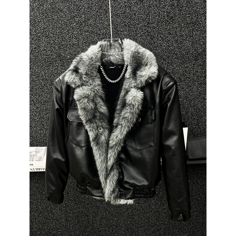 2024冬の高級感ファッションpu皮衣コート男痞帅毛皮一体模造皮草座山彫刻コート潮