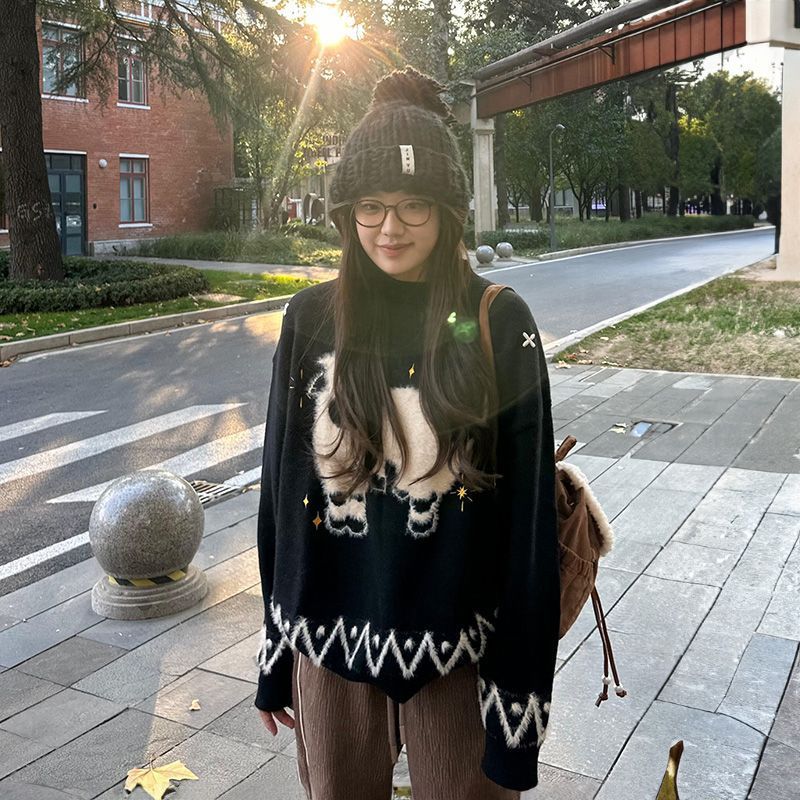 レトロなクリスマスジャカードのデザイン感丸首セーター女子学生秋冬のゆったりした雰囲気感がニットのファッションを厚くします。
