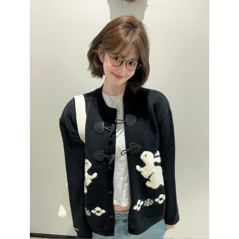 韩系牛角扣兔子绣花长袖t恤2025春秋季新款穿搭慵懒外套开衫上衣