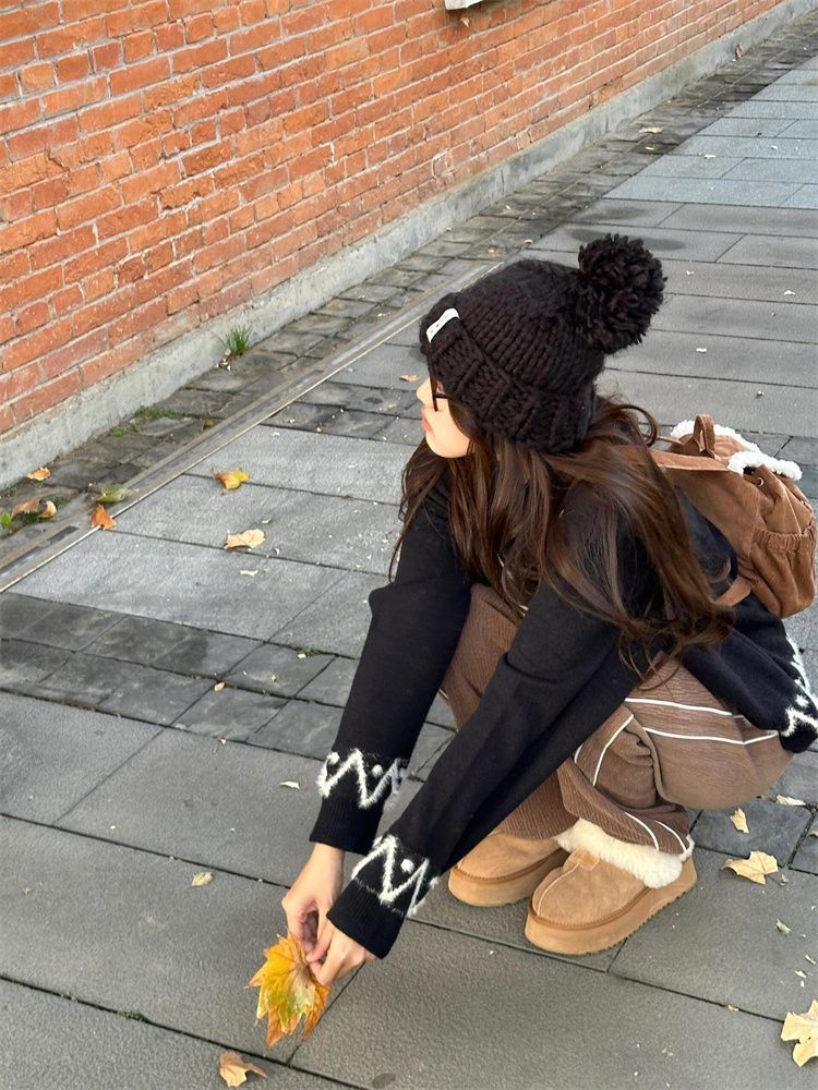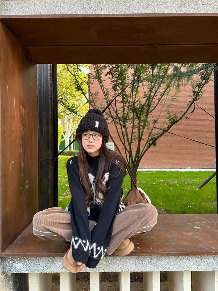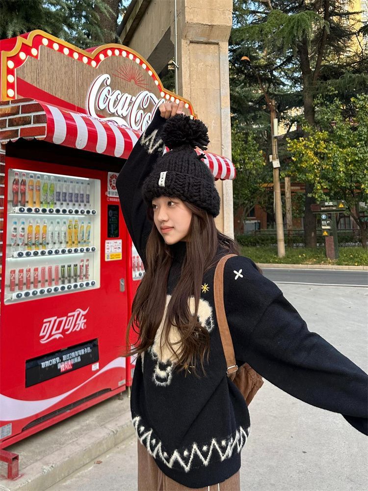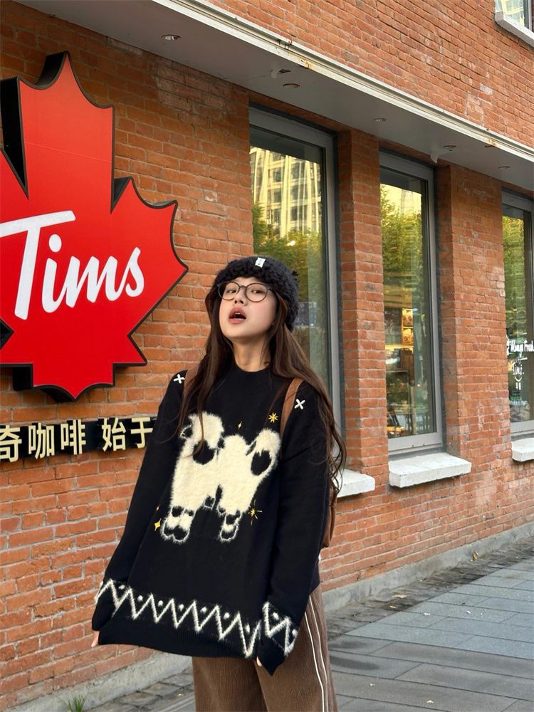 韓国版のファッションの甘い趣味の子羊のジャカードの黒色の保温のセーターの女性の秋冬の新型のゆったりしているニットのファッション