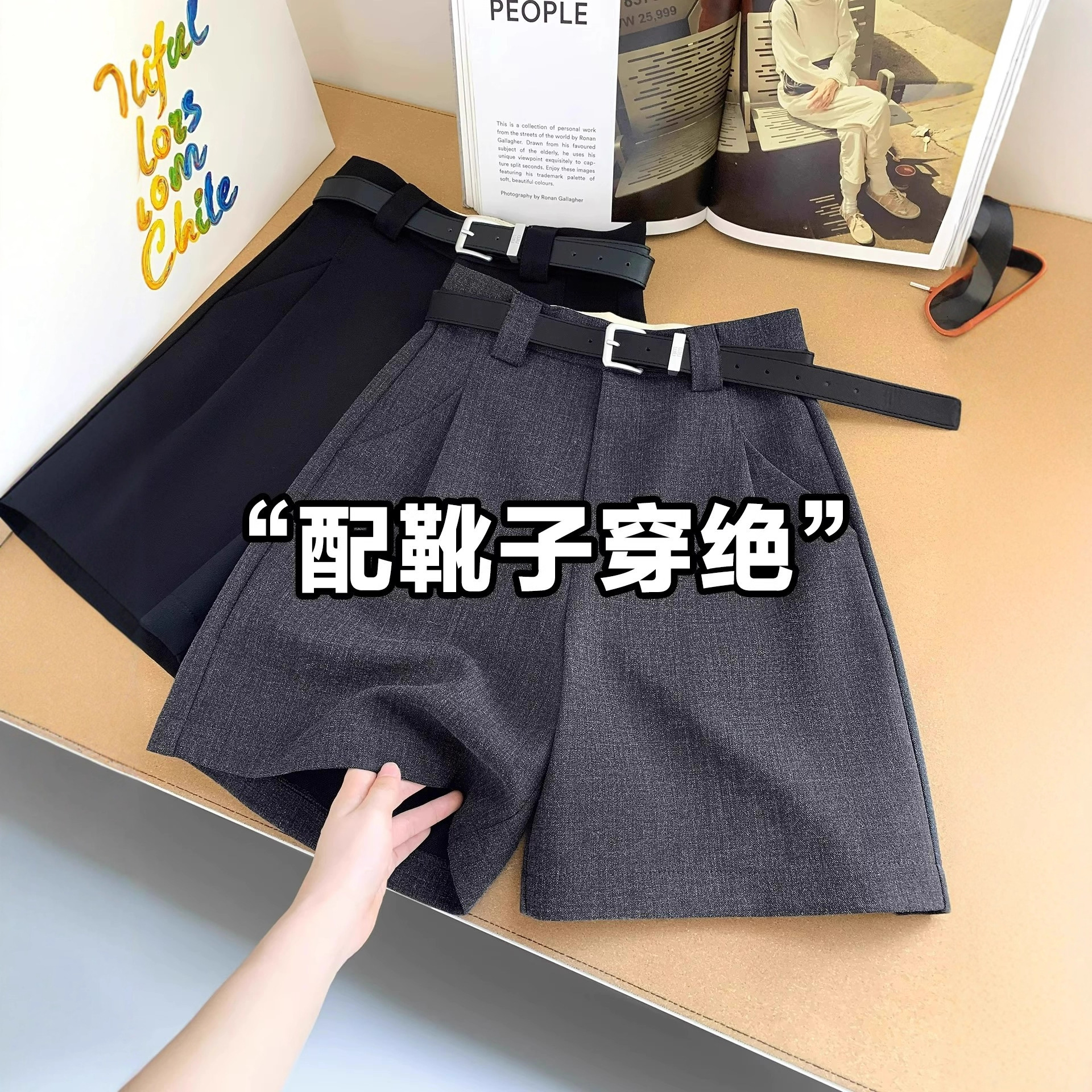 灰色高腰西装短裤女春秋抗皱配靴子外穿靴裤热裤高级感阔腿五分裤