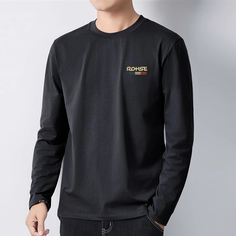メンズ長袖黒色裏起毛純綿トップス、ラウンドネック、秋冬用インナーウェア