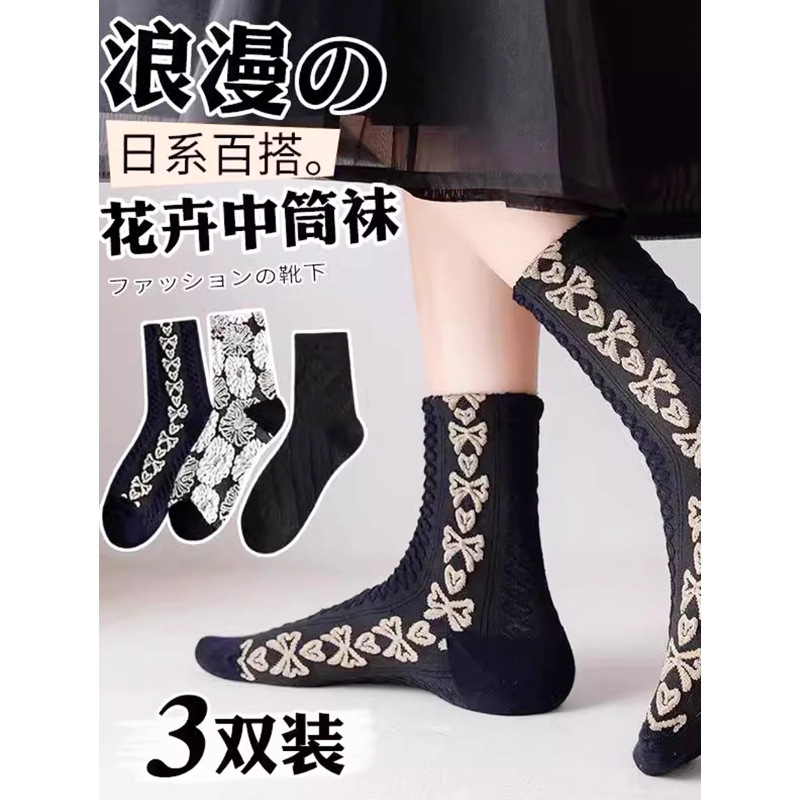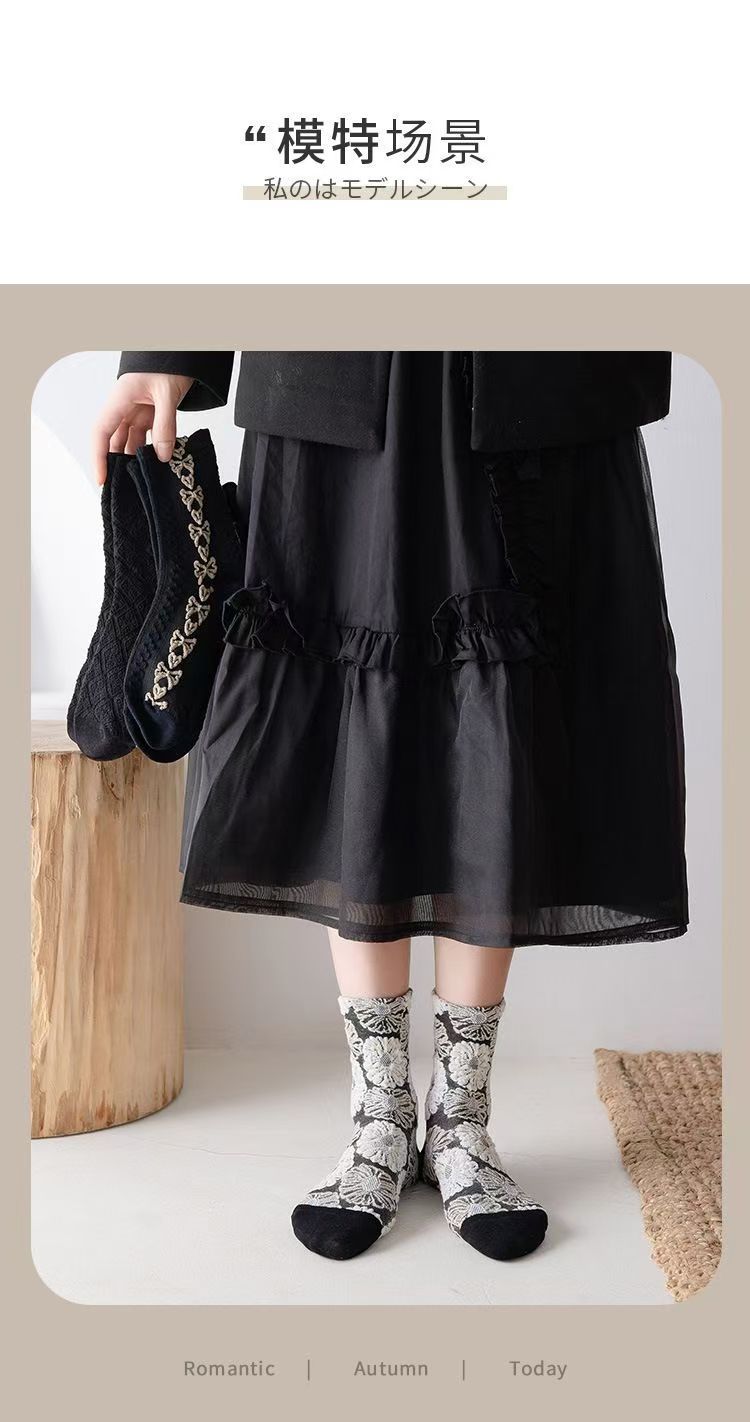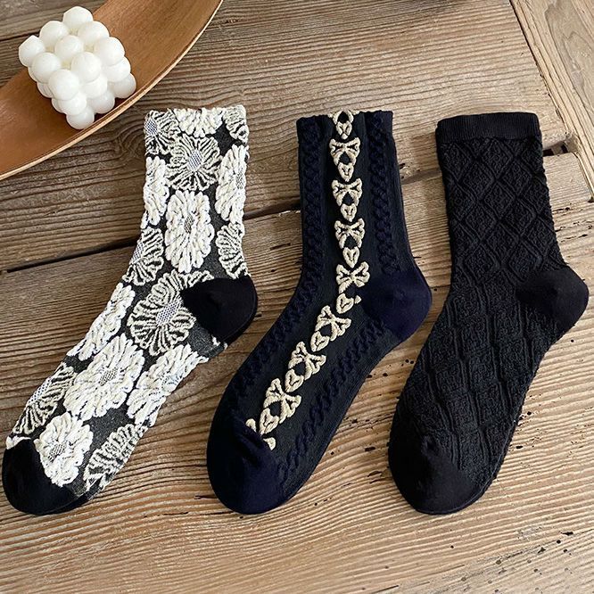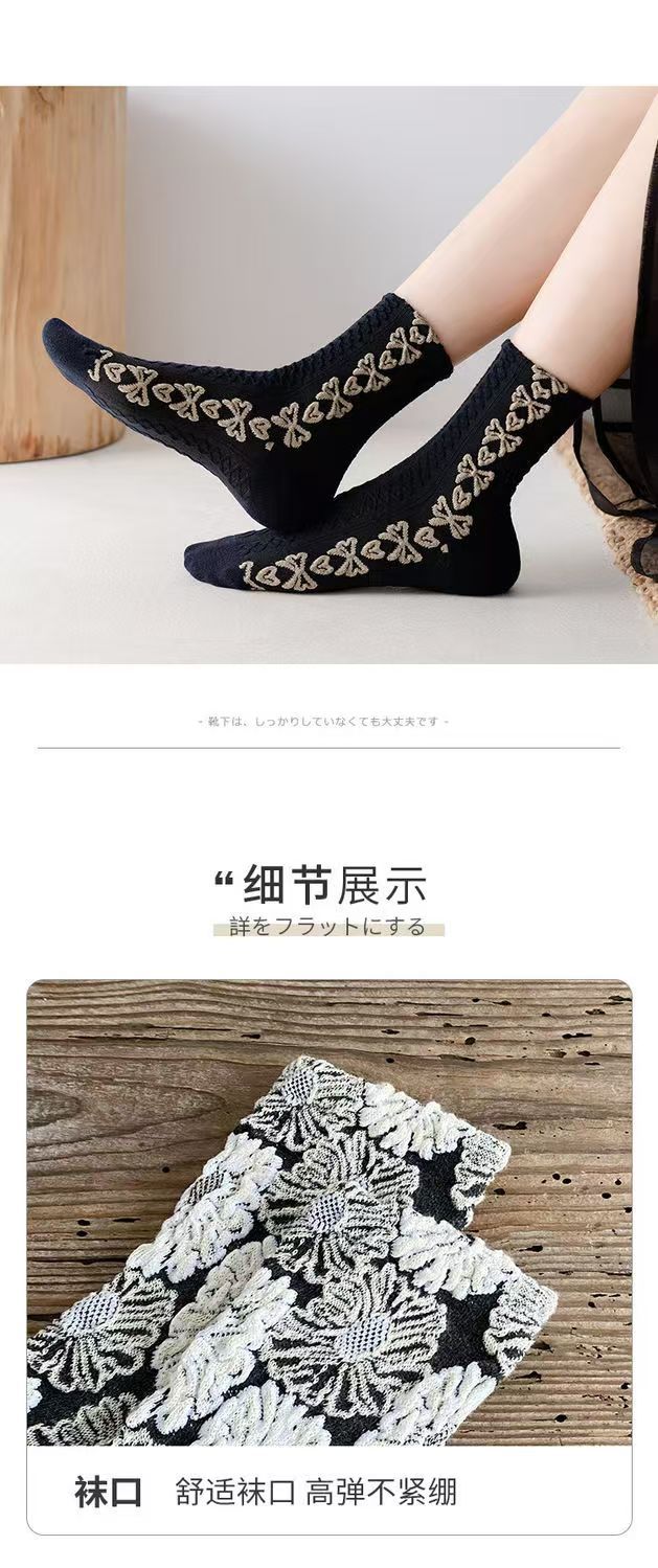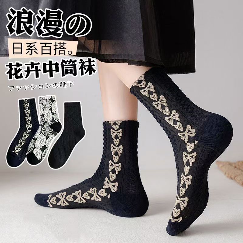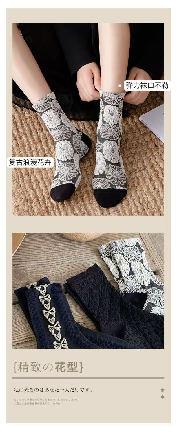 宮廷風レトロ立体レリーフ靴下女性中筒秋冬甘美小衆花可愛い森系カジュアル着心地