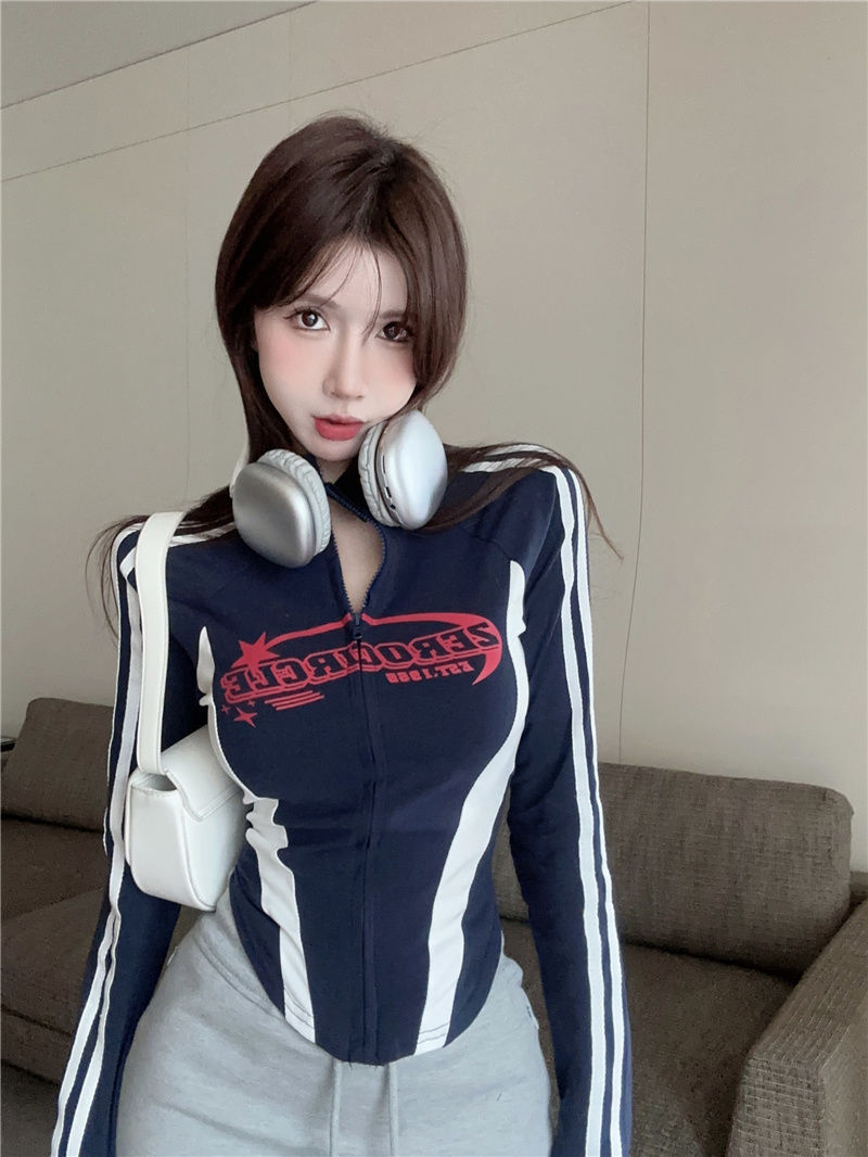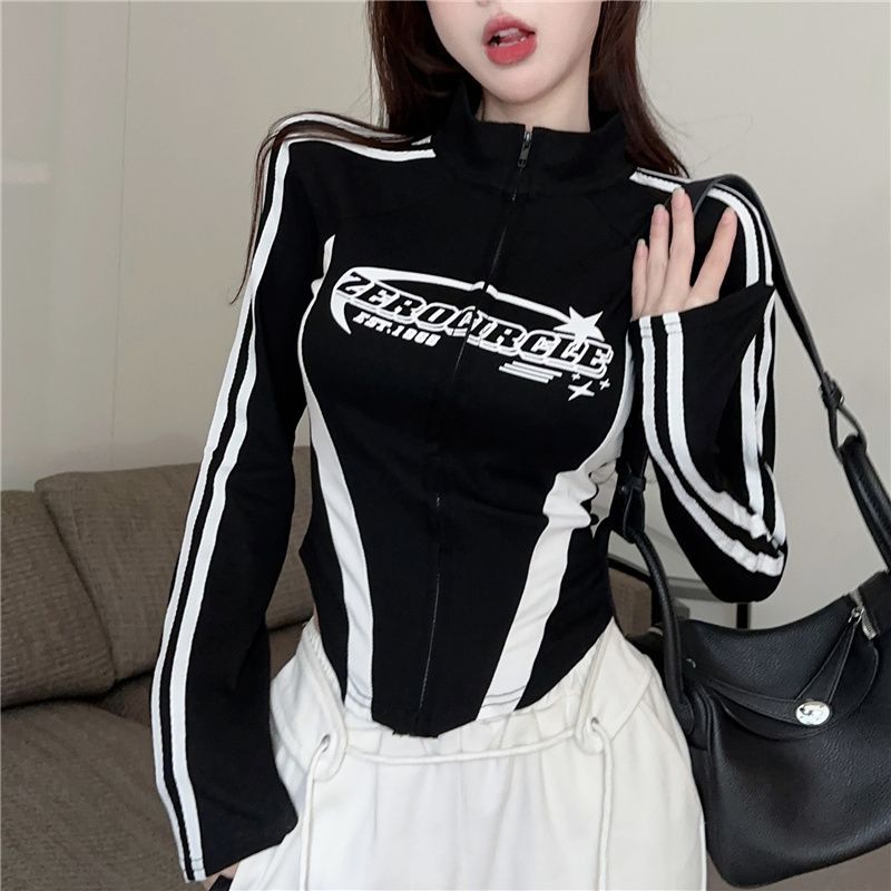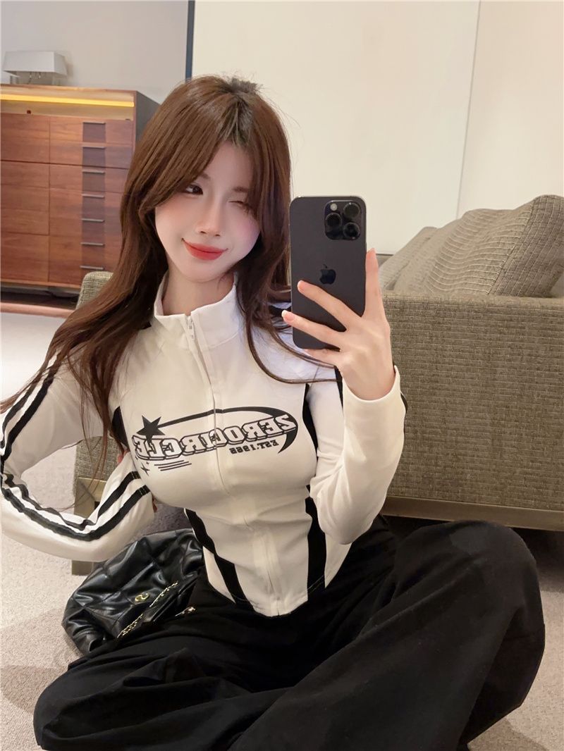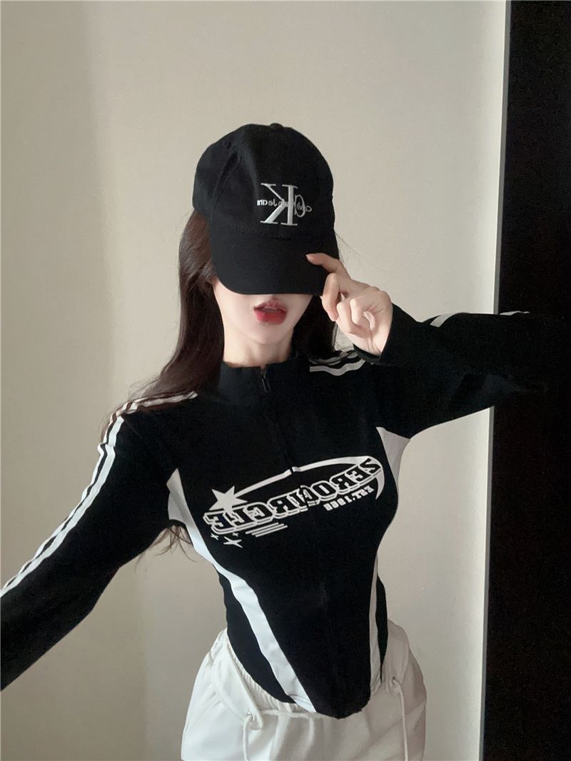 レトロなミレニアムギャルの短い長袖tシャツの女性の秋の新型のアメリカのプリントの丸首は身を修めて底の上着の潮を打ちます。
