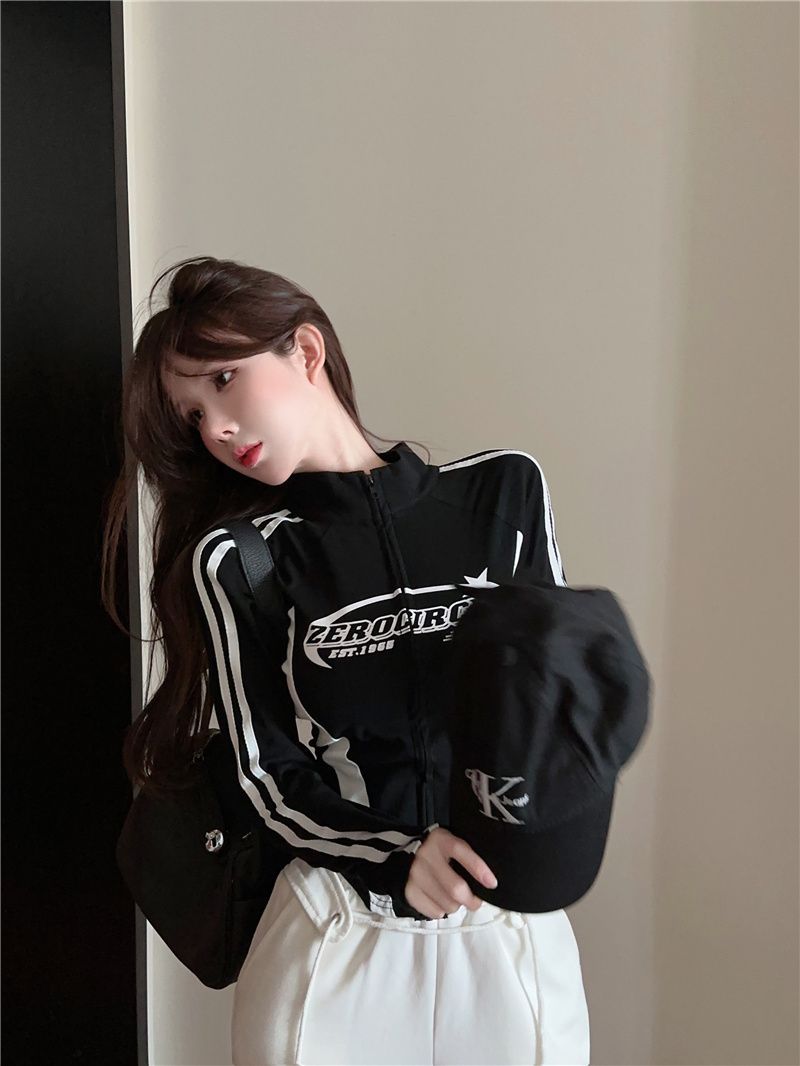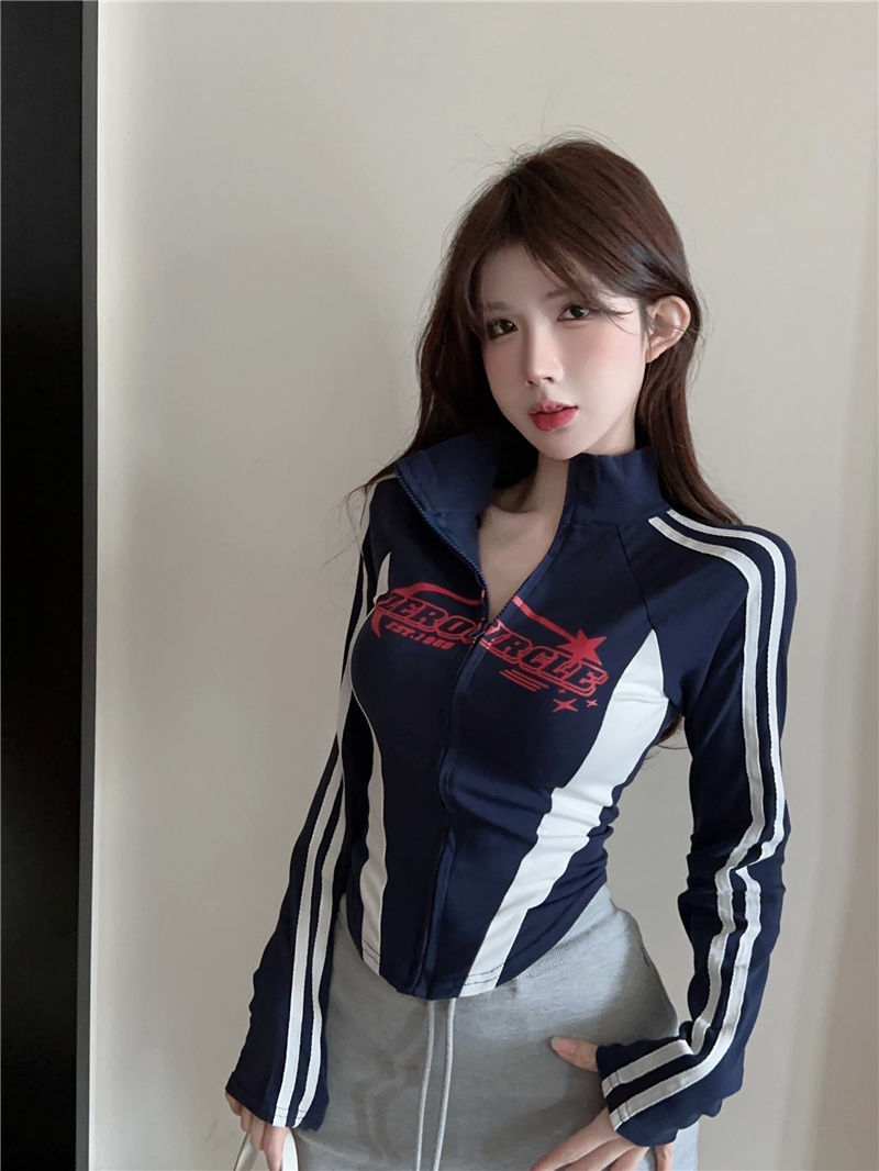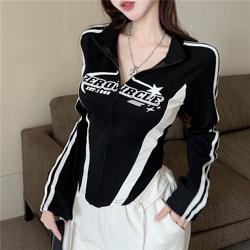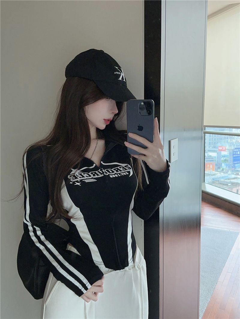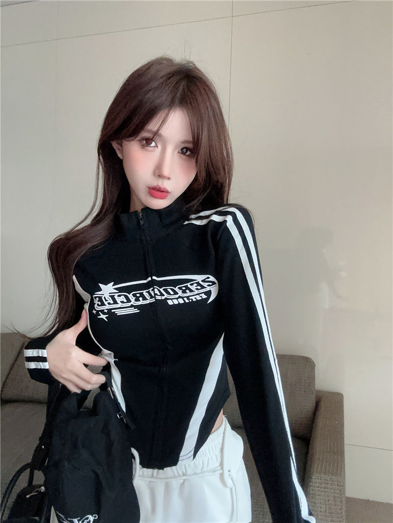 レトロなミレニアムギャルの短い長袖tシャツの女性の秋の新型のアメリカのプリントの丸首は身を修めて底の上着の潮を打ちます。