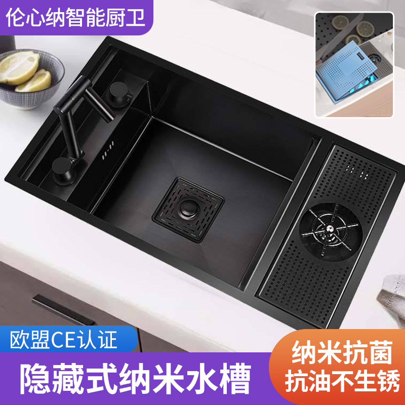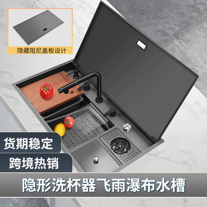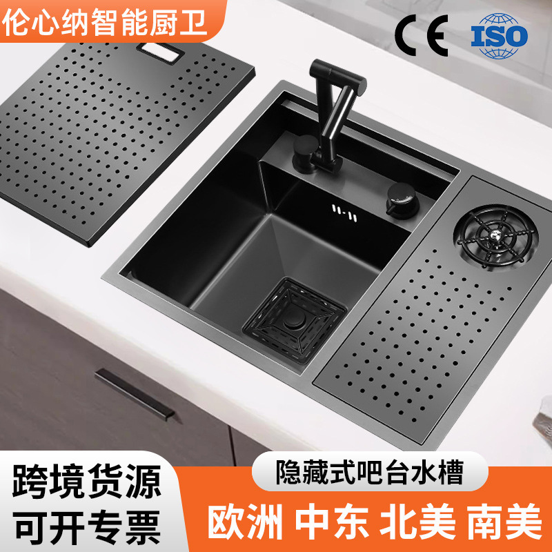 隠しバーシンク台所ステルス手作りシングル槽蓋付き中島トランペット水たまりステンレスナノ黒シングル槽