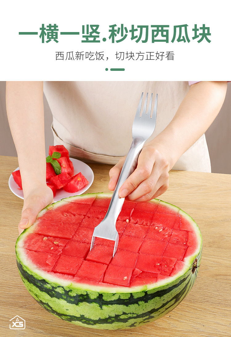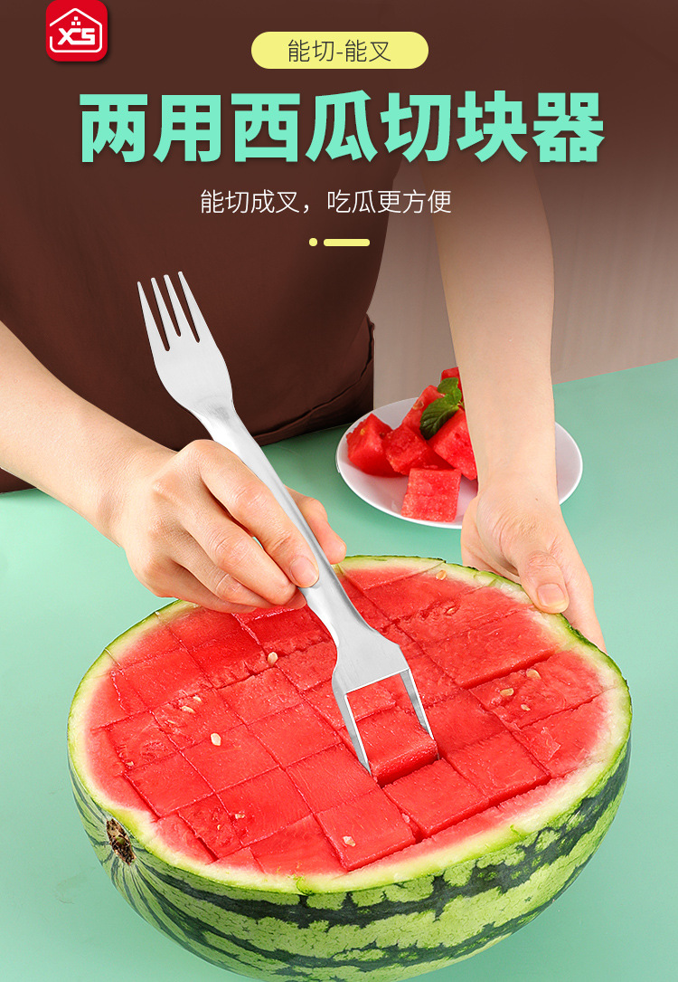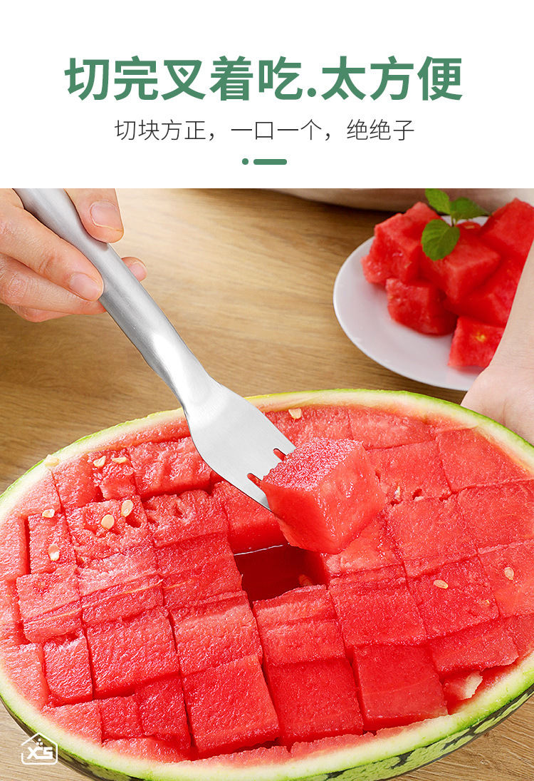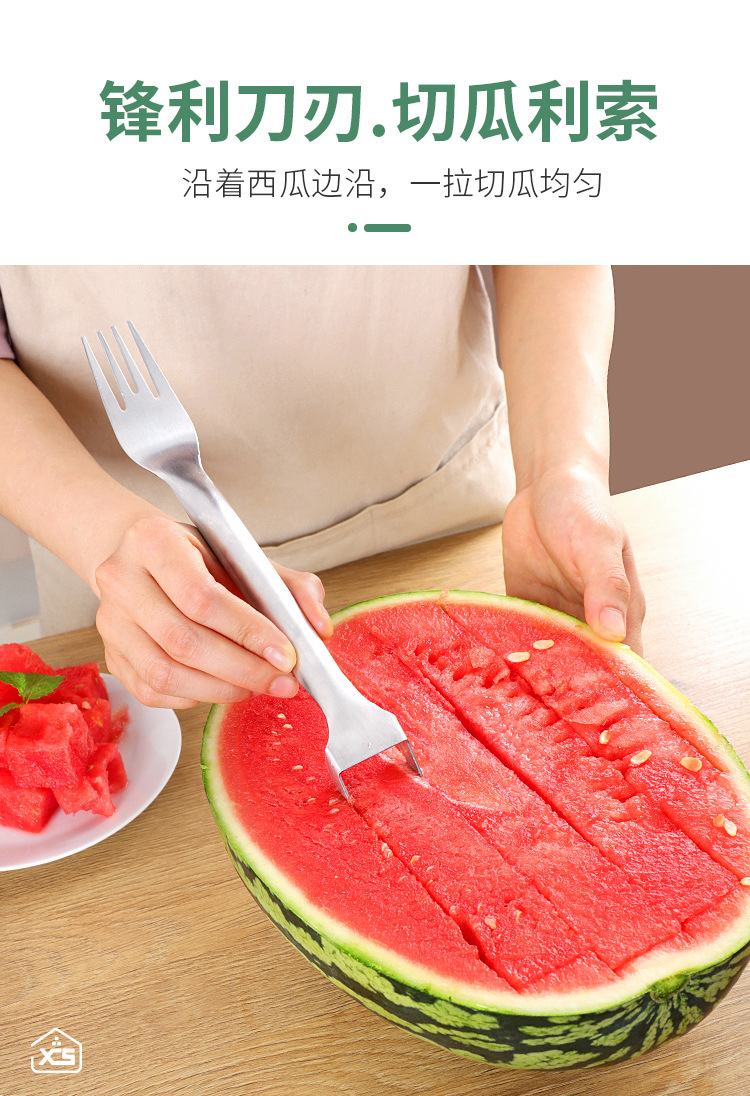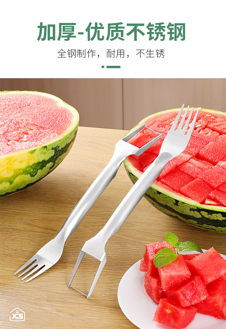 メロンの神器を食べるダブルヘッドはステンレスのスイカで業務用家庭用多機能二合一フォークスイカチョッパーを切ることができます。