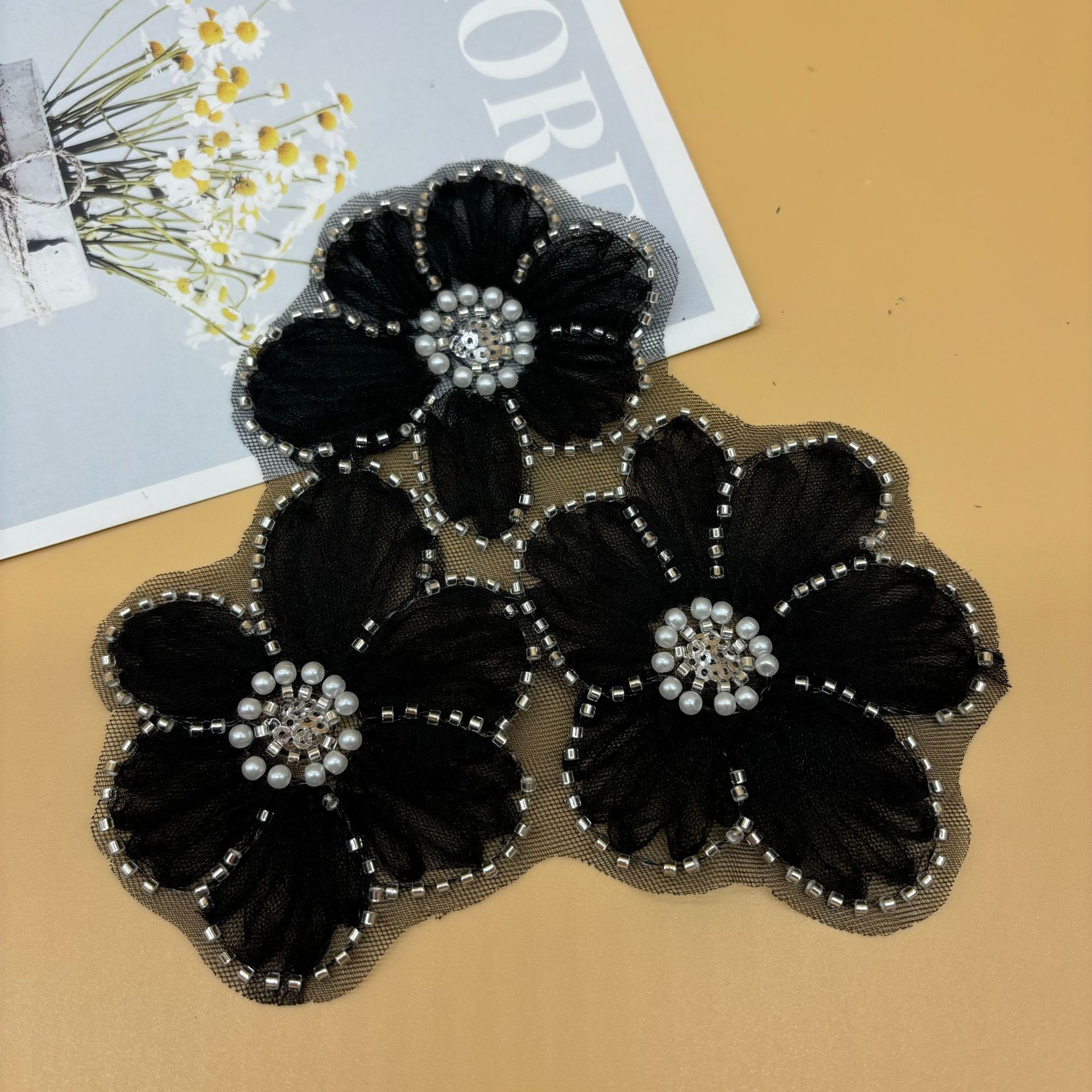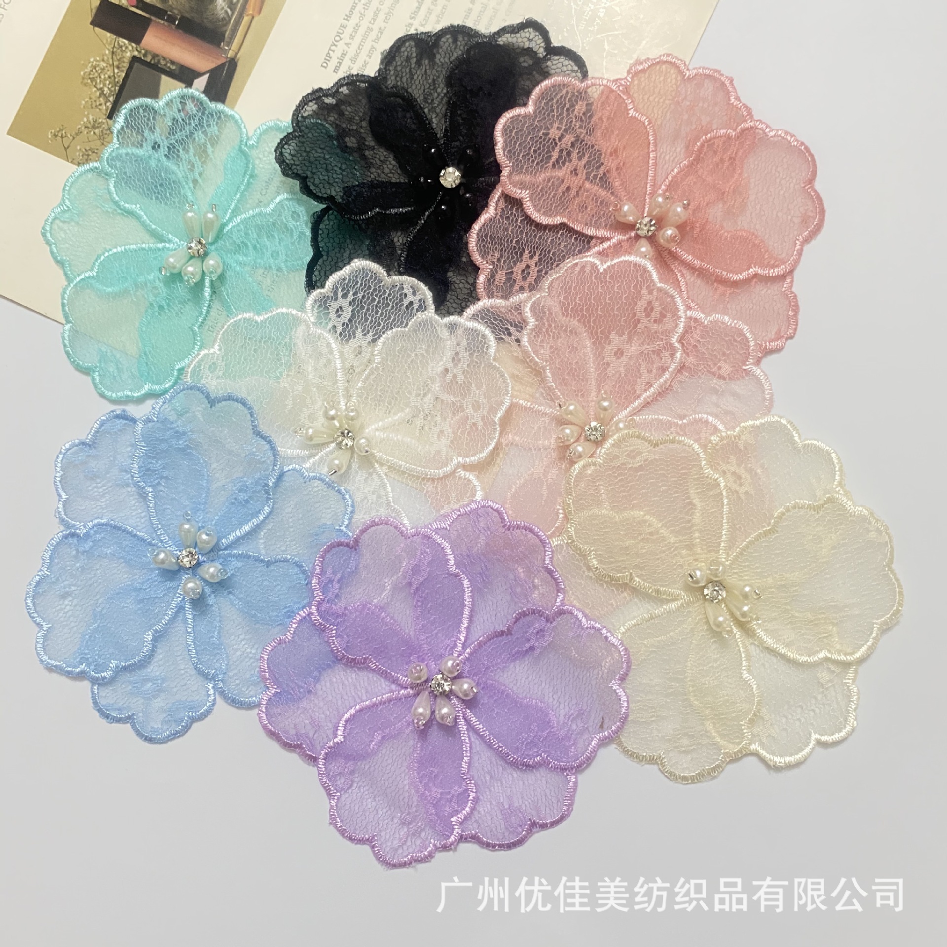新型蕾欧根紗レース刺繍立体花DIY子供服手作りビーズレース花服装補助材料