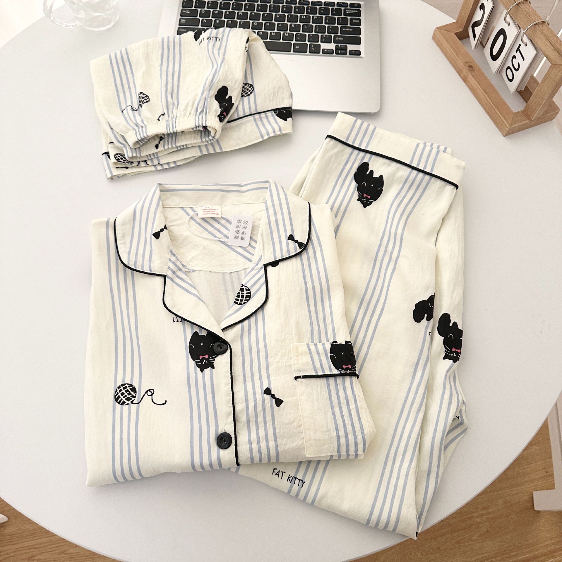 雲の綿のパジャマの女性の春の夏のかわいい猫のストライプの半袖の3つのセットのゆったりした少女の家の服は外に着ることができます。