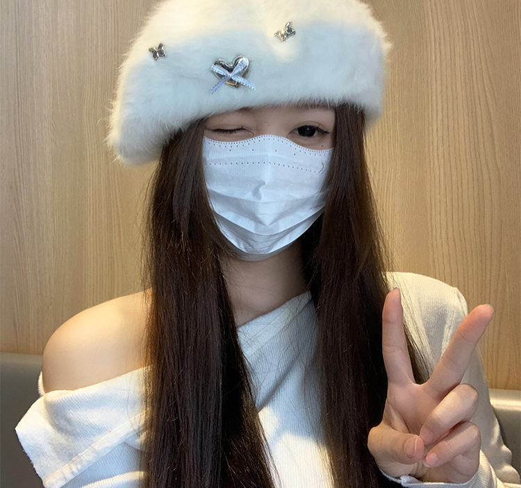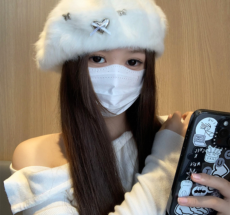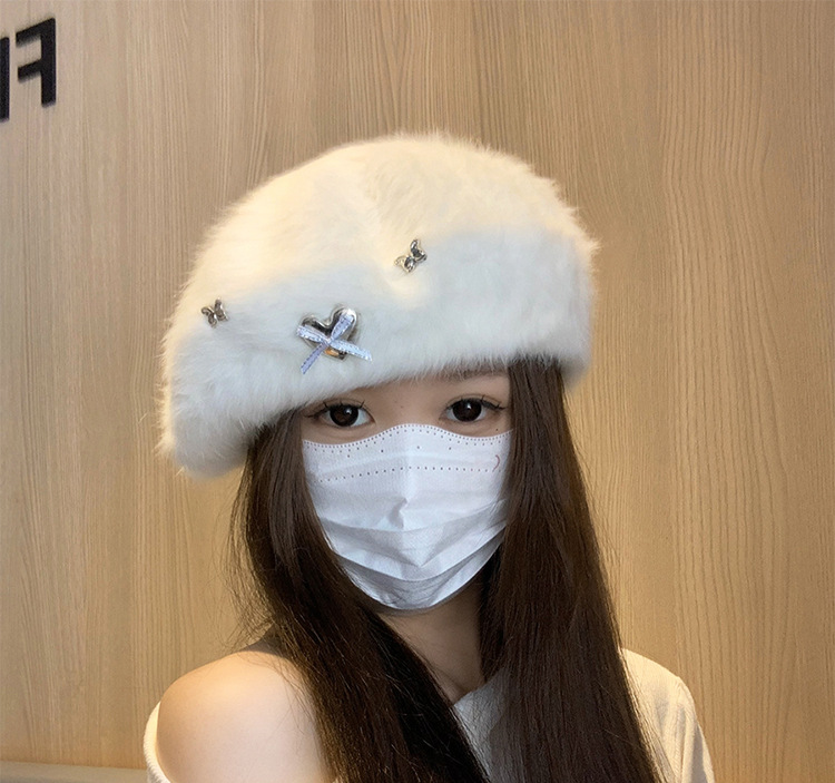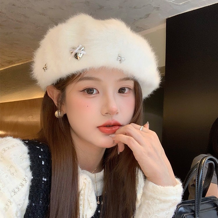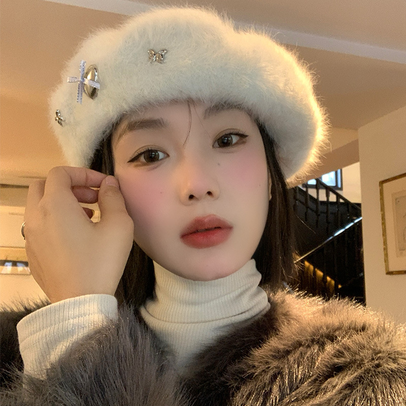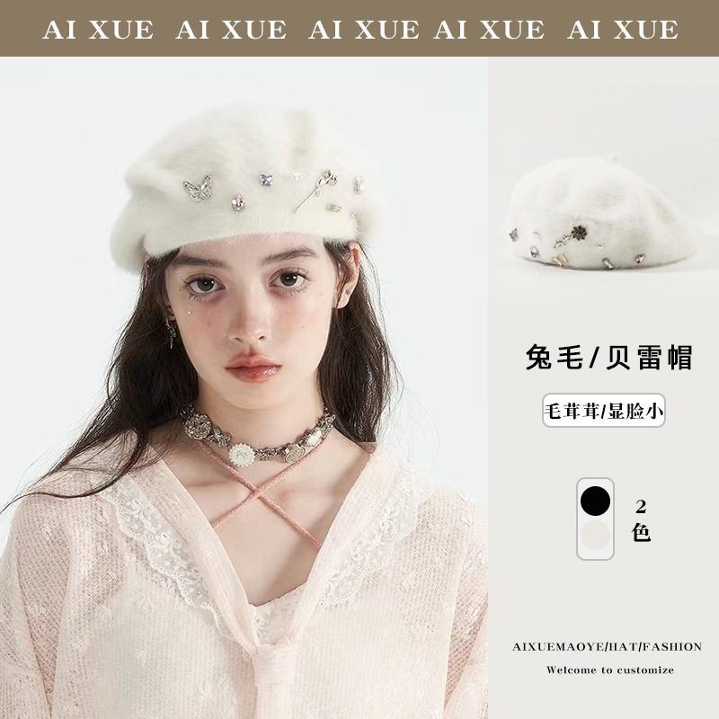 2025秋冬新作ウサギ毛皮ベレー帽蝶とバラのラインストーンの組み合わせホワイトガールズハット暖かいベレー帽