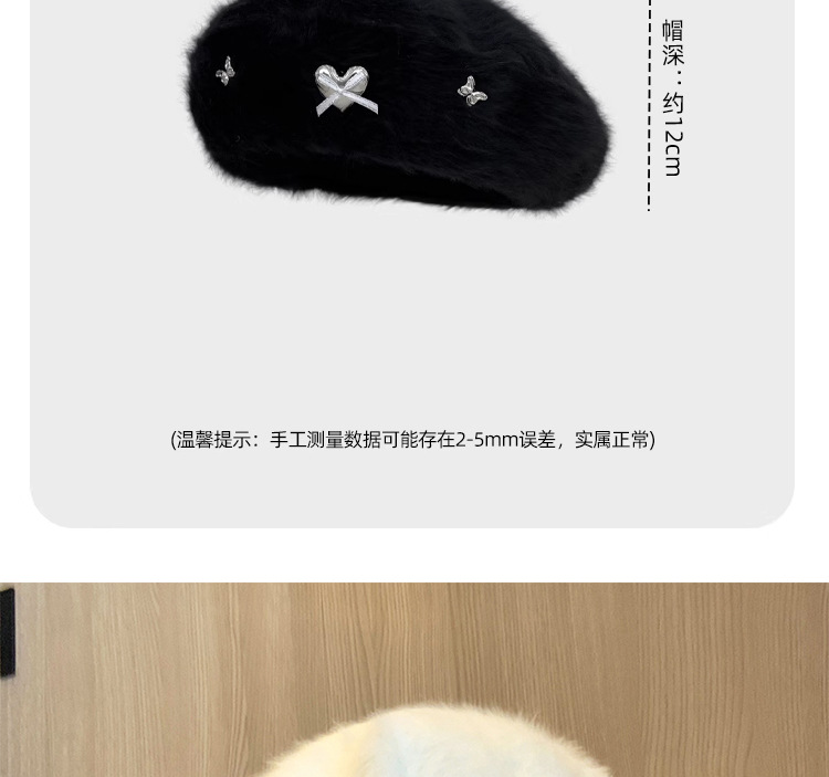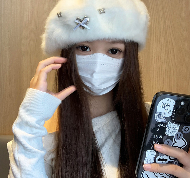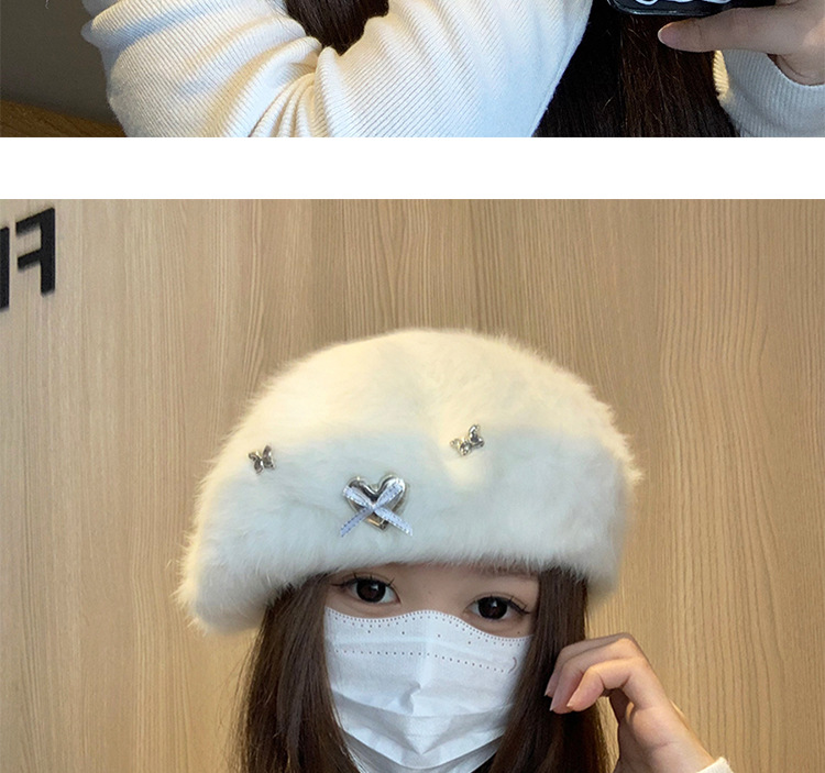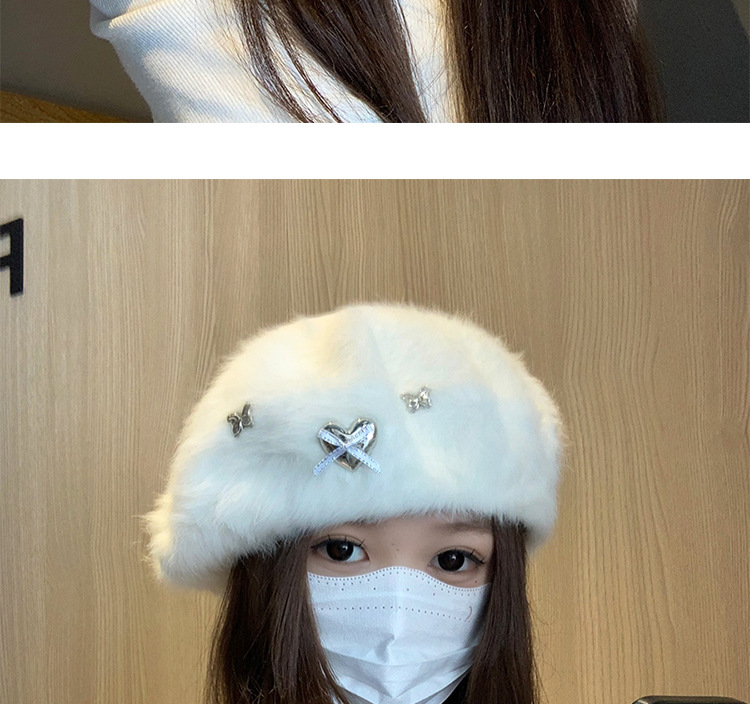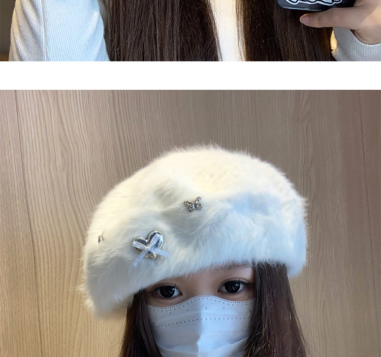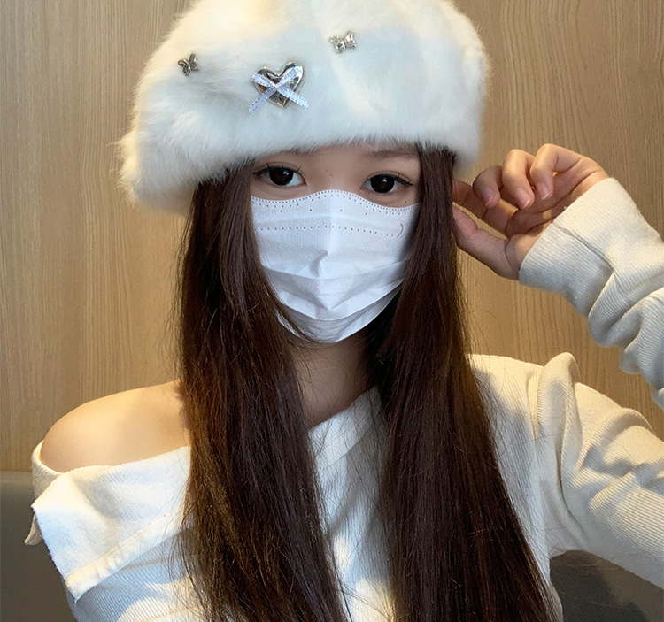 2025秋冬新作ウサギ毛皮ベレー帽蝶とバラのラインストーンの組み合わせホワイトガールズハット暖かいベレー帽