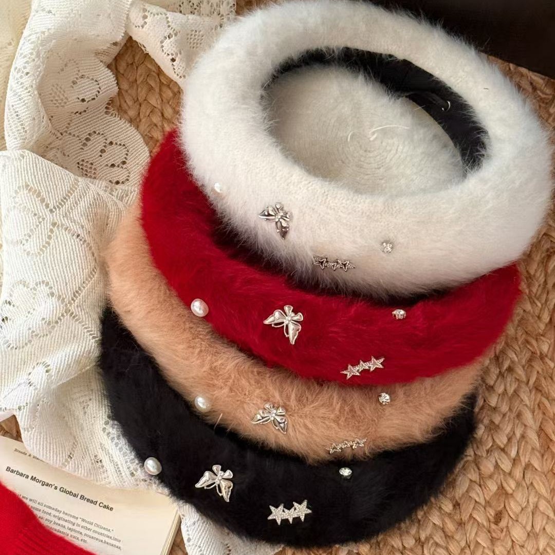 韩版秋冬毛绒贝雷帽女甜美珍珠水钻蝴蝶结装饰时尚宽边帽批发