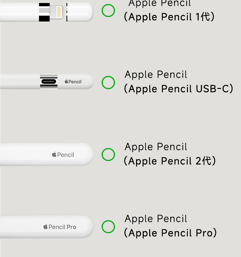 Apple pencil 1代、Apple pencil 2代、Apple pencil (USB-C)、Apple pencil Pro