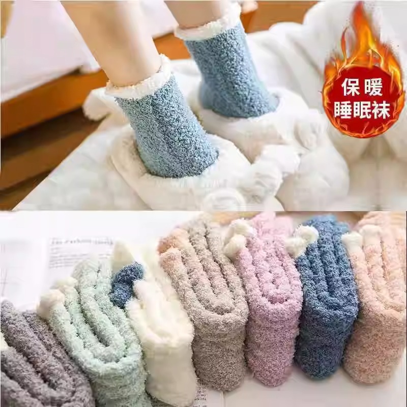 靴下の女性は冬にベルベットを厚くしてサンゴの靴下を厚くしてかわいい日系の家の床の靴下で寝ている毛のふわふわした靴下