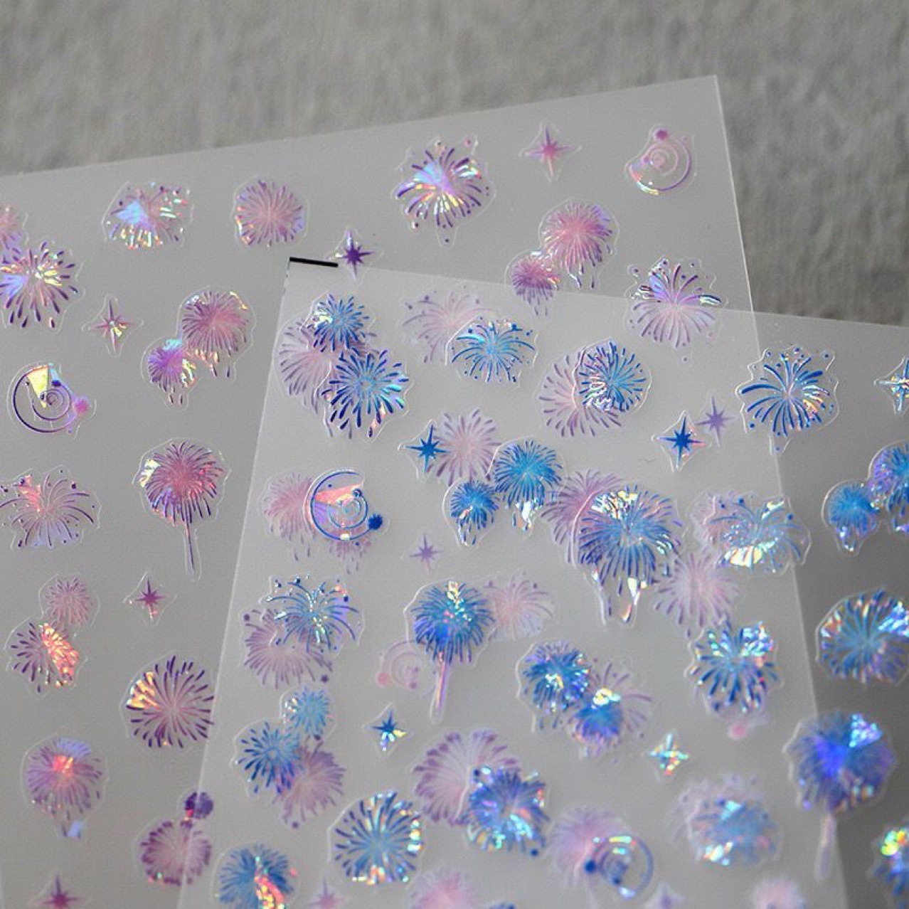 ネットの赤い爆発の祝い事の花火のネイルステッカーのまぶしいレーザーのきらきらと輝くピンクの青い花火の2025新型のネイルステッカー