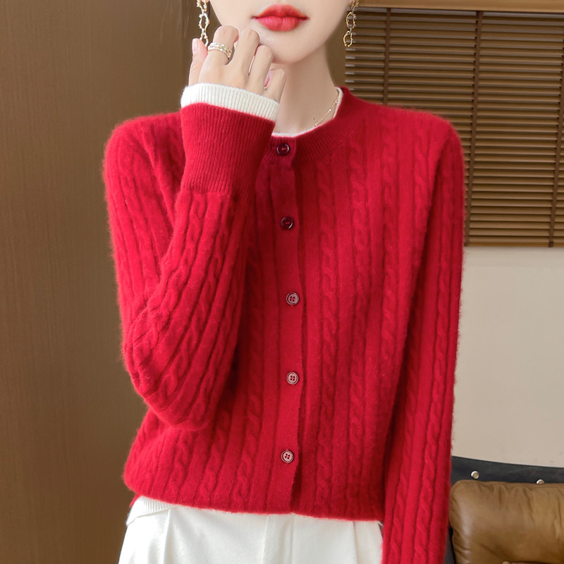 ウール混紡24秋冬新作女装丸首小麻花色合わせファッション保温ショートニットカーディガン