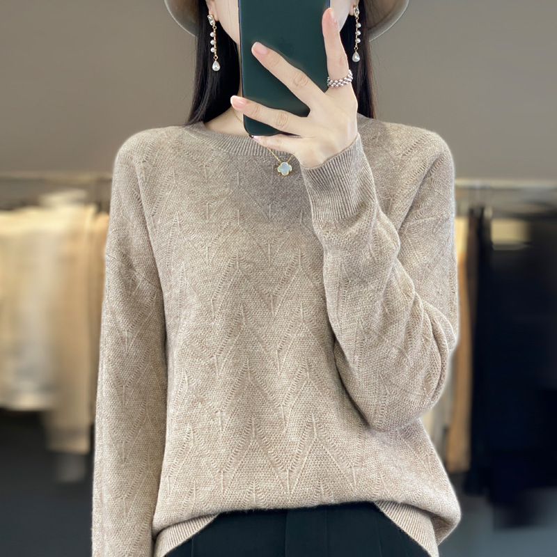秋冬の新型アンディの毛のニットのカーディガンを卸売りします。女性の丸首の透かし彫りのジャカードのセーターの長袖のプルオーバー